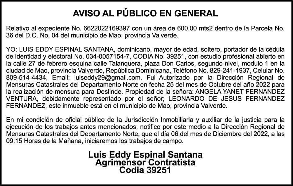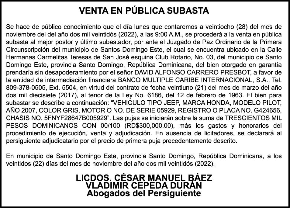 AVISO TRASPASO DE EMBARCACION La señora YAHAIRA LANTIGUA MARTINEZ, traspasa el bote de pesca "YAHA", matricula. No. BP-Y97-2204SBS, de 20.0 pies de eslora, color Blanco y Naranja, al Sr. LUIS MANUEL PEREZ LOPEZ, como nuevo propietario.