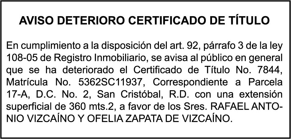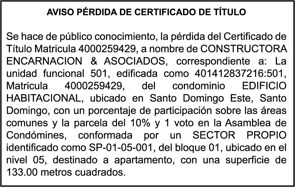 SE hace de público conocimiento la pérdida de certificado de depósito número 776555476 emitido por Banco Popular Dominicano, S. A., a favor de ALMILENE MEDINA TAPIA, portador de la Cédula de Identidad y Electoral número 001-0011681-3, expedido en fecha 27 de septiembre de 2012 por el monto de (RD$276,000.00), capital más intereses generados a la fecha.