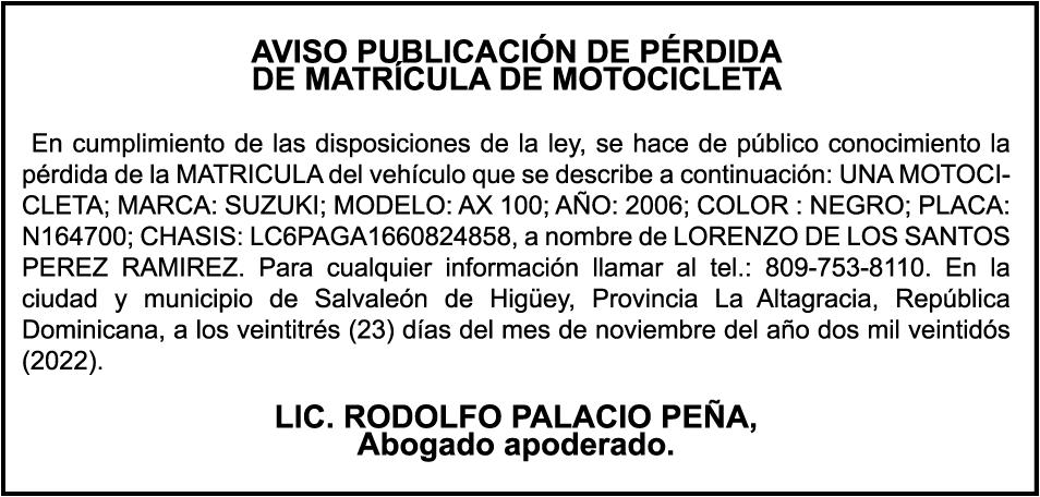 PERDIDA DE PLACA No. k1996860, Motocicleta SUZUKI, Modelo AX100, Color NEGRO, Año 2020, Chasis LC6PAGA11L0013674, a nombre de a nombre de BREIDI ABRAHAM ROSARIO.