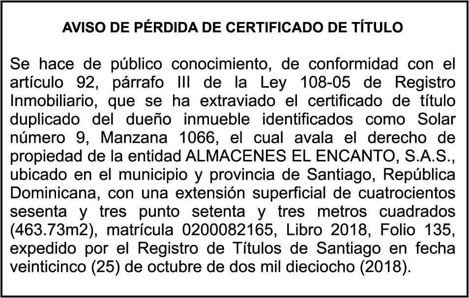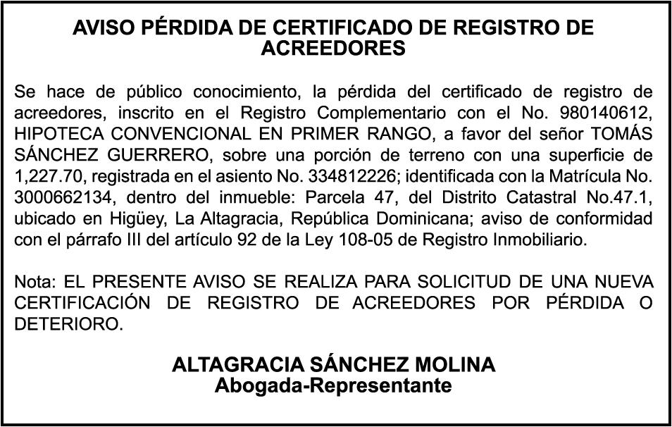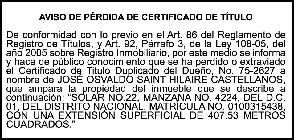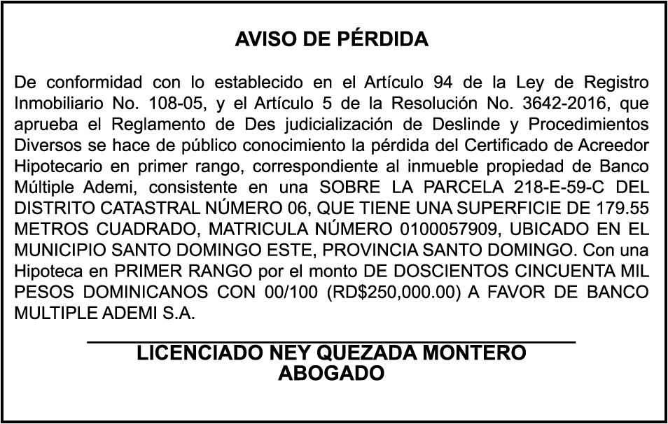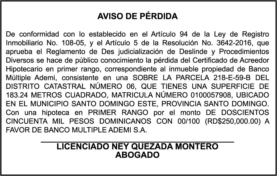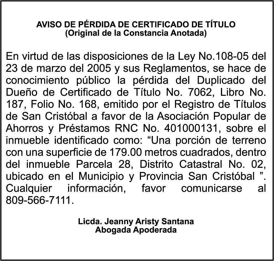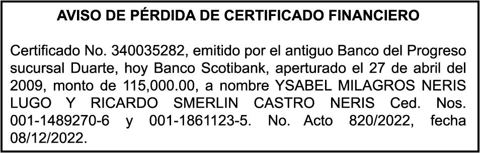 SE hace de público conocimiento la pérdida de certificado de depósito número 760927681 emitido por Banco Popular Dominicano, S. A., a favor de NELSON EDDY VASQUEZ ESCAÑO, portador de la Cedula de identidad y Electoral número 001-0013560-7, expedido en fecha 5 de julio de 2010 por el monto de (RD$2,213,729.17), capital más intereses generados a la fecha.