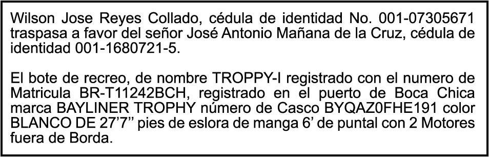 PERDIDA DE PLACA: N0. L421234, Chasis 1FVHCYDJ57HW31662, Marca FREIGHTLINER, Modelo M2 106 MEDIUM DUTY, AñO 2007, Color BLANCO, a nombre de DARWIN DE JESUS DE LA ROSA VASQUEZ, Ced. 04701578561