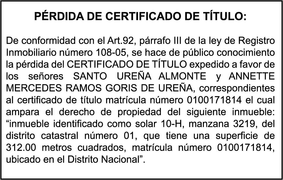 SE hace de público conocimiento la pérdida de certificado de depósito número 816353486 emitido Banco Popular Dominicano, S. A., a favor de WANDA BANIBEL NAVARRO RAMIREZ Portadora de la Cédula de Identidad y Electoral número 0230162774-7 en fecha 2 de diciembre de 2019 por el monto de RD$4,200,446.03