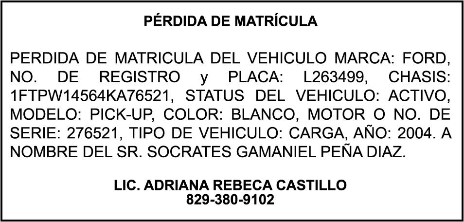 AVISO:TRASPASO DE EMBARCACION. EL Señor FERNANDO MEDINA, traspasa el bote de recreo de nombre “MEDINA-I”, matricula. No. BR-M1922319SBS, de 23.5 pies de eslora, al Sr. JESE MANUEL SANTANA TORRES, como nuevo propietario.