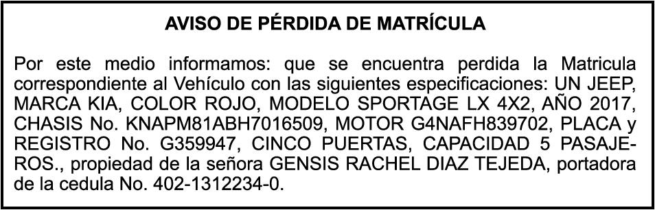 PERIDA DE MATRICULA:Del JEEP, Placa G162175, Chasis JTEBY25J700056236, Marca TOYOTA, Modelo KZJ10L-GKPGT, AñO 2007, Color NEGRO, a nombre de JOSE ADELICIO ANTIAGUA, Ced. 00800222861