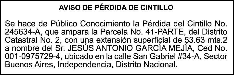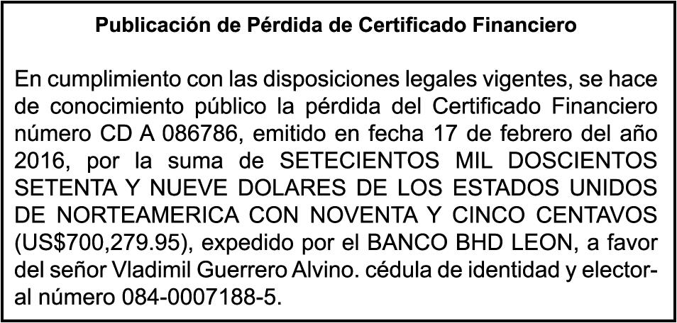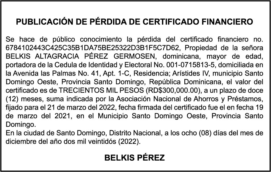 SE hace de público conocimiento la pérdida de certificado de depósito número 824872907 emitido Banco Popular Dominicano, S. A., a favor de RAQUEL PEGUERO SANTANA Portadora de la Cédula de Identidad y Electoral número 026-00904565en fecha 10 de noviembre de 2021 por el monto de (RD$16,000.00).