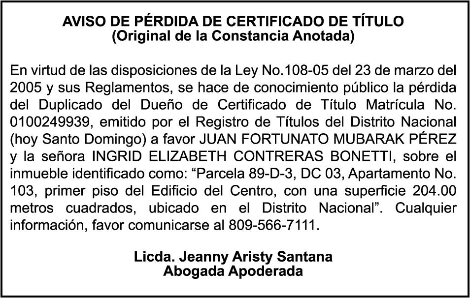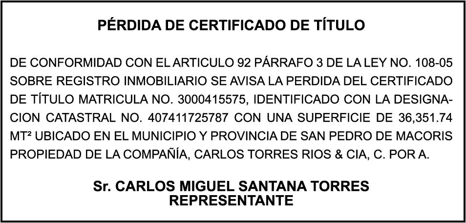 SE hace de público conocimiento la pérdida de certificado de depósito número 820208981 emitido Banco Popular Dominicano, S. A., a favor de CARMEN ELIZABETH PEÑA ORTIZ Portadora de la Cédula de Identidad y Electoral número 001-04503180 en fecha 6 de enero de 2021 por el monto de (RD$101,903.23).