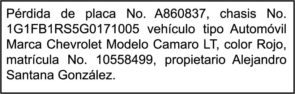 PERDIDA DE PLACA No. A675815, del vehículo marca HONDA, Modelo ACCORD EX, año 2012 , color GRIS, Chasis No. 1HGCP2F73CA141590, a nombre de FRANCIS GLEY MATOS POLANCO, CED. No. 023-0156443-7.