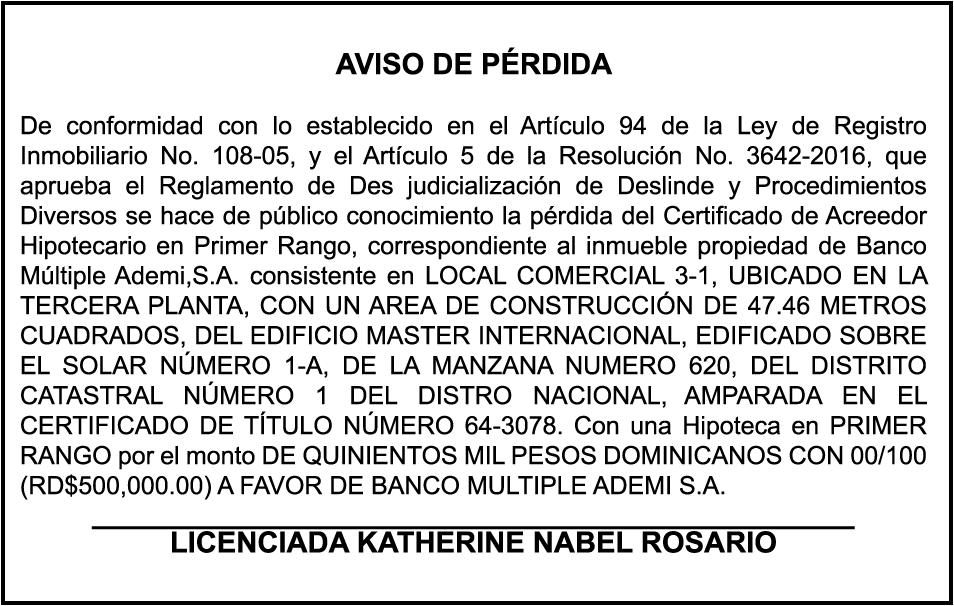 SE hace de público conocimiento la pérdida de certificado de depósito número 824872907 emitido Banco Popular Dominicano, S. A., a favor de RAQUEL PEGUERO SANTANA Portadora de la Cédula de Identidad y Electoral número 026-0090456-5en fecha 10 de noviembre de 2021 por el monto de (RD$16,000.00).