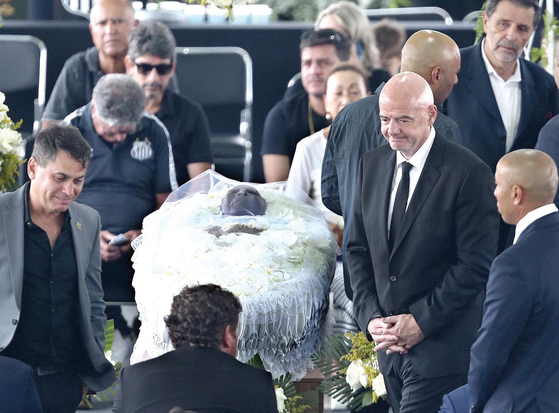 El ataúd de Pelé fue colocado sobre la cancha donde el deportista marcó algunos de los mejores goles en su carrera. Los asistentes al funeral caminaron ante el cadáver en el estadio con
