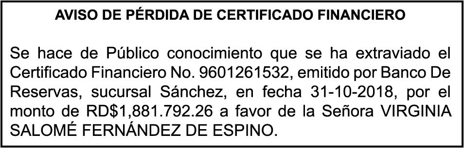 AVISO PERDIDA DE CERTIFICADO FINANCIERO Se ha extraviado el Certificado Financierro No. 779148428, emitido por el Banco Popular Dominicano en fecha 2602-2013, por el monto de RD$369,000.00, a favor de la señora DORIS EBELINA FELIZ FELIZ, Ced. 2250006387-4.