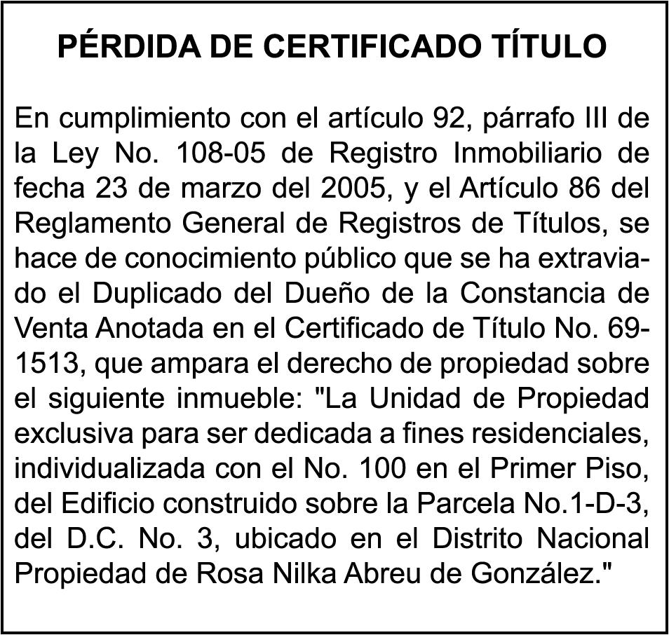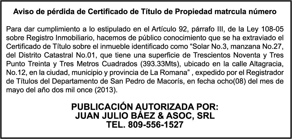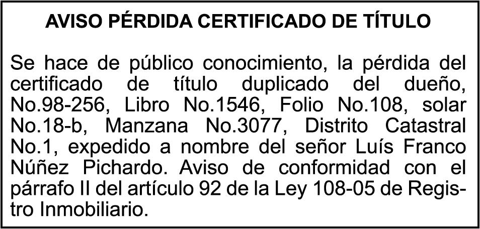 SE hace de público conocimiento la pérdida de certificado de depósito número 798078317 emitido Banco Popular Dominicano, S. A., a favor de ALBA JULISSA ECHAVARRIA MARTINEZ Portadora de la Cédula de Identidad y Electoral número 001-0254996-1, certificado expedido en fecha 2 de agosto de 2016 por el monto de (RD$104,198.64), de capital más intereses generados a la fecha.