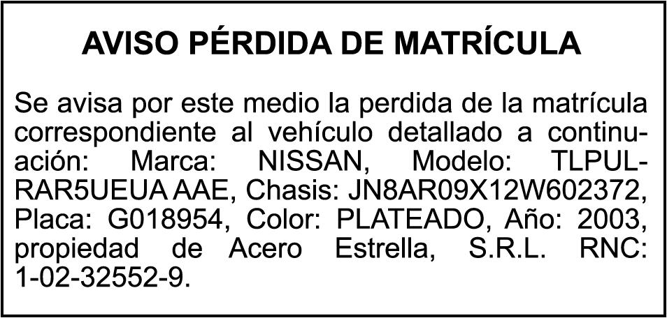 PERDIDA DE MATRICULA:Del Vehiculo ,Placa L250837, Chasis JDA00V11800028074, Marca DAIHATSU, Modelo V118LHY, Color BLANCO, AÑO 2008, a nombre de DISTRIBUIDORA DEG SRL, RNC. 130376621