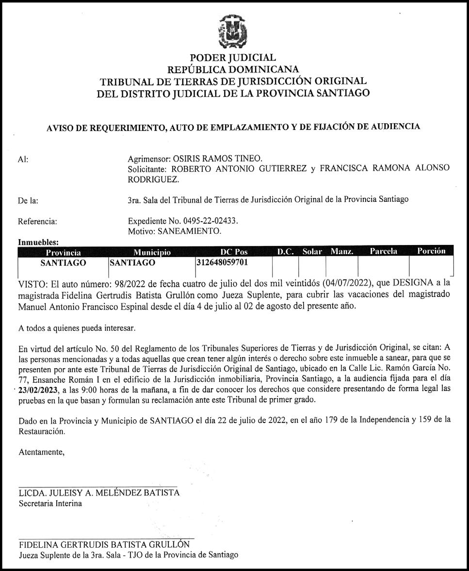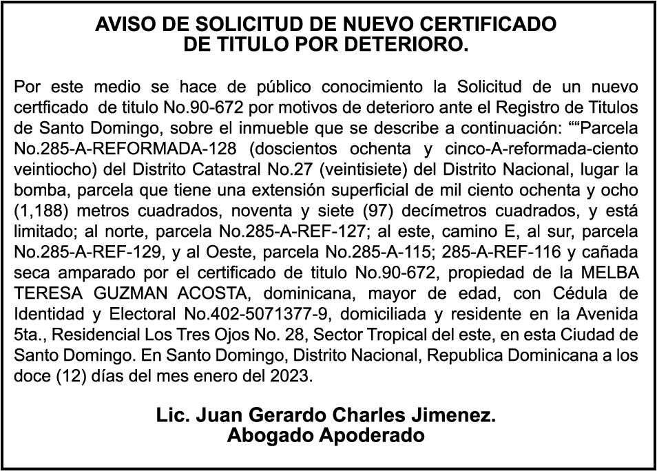 SE hace de público conocimiento la pérdida de los Certificados Vigentes un (1) accionista, marcados con los números 128980 y 160557, adquiridos en fechas 25/08/2009 y 28/04/2014, respectivamente, emitido por el BANCO POPULAR DOMINICANO, para un total de acciones de 2000, 566 nombre de HECTOR PORTIFIRIO REYES MONI, portador de la cedula no. 0280009461-3.