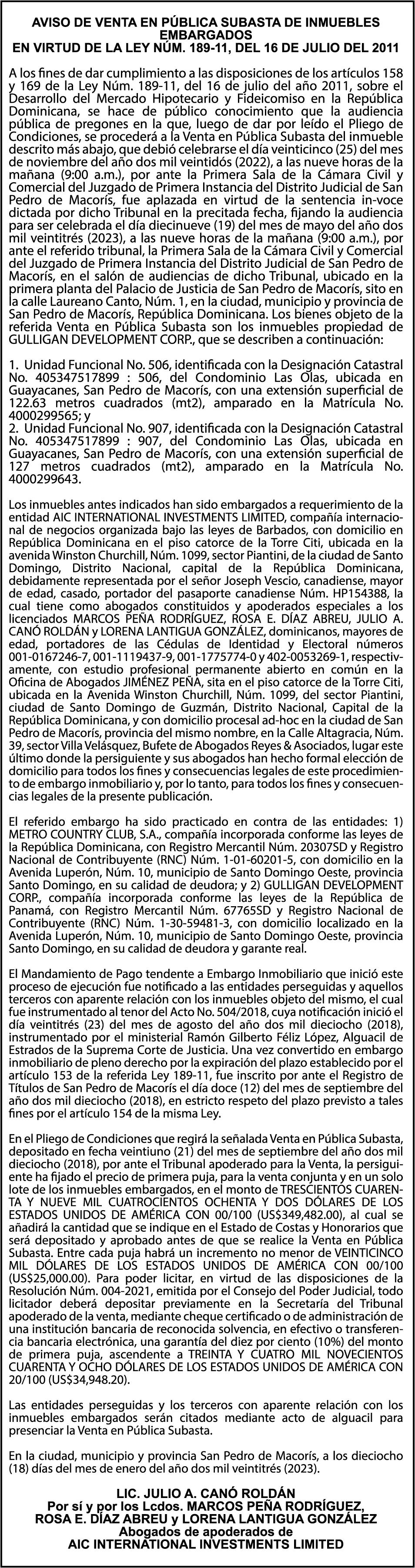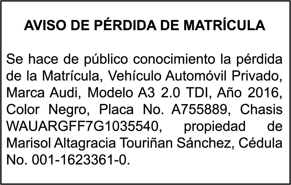 PERDIDA DE PLACA No. K1142062, Motocicleta BAJAJ, modelo PLATINA 100 ES, oclor negro, año 2017, chasis MD2A76AZ8HWF48379, a nombre de FREDDY ANTONIO MENDEZ DE LOS SANTOS. PERDIDA DE MATRICULA Automovil Privado TOYOTA, Modelo COROLLA , Color GRIS, Año 1988, Placa A030767, Chasis JT2AE92GXJ0033505, a nombre de RAMON A TAPIA.