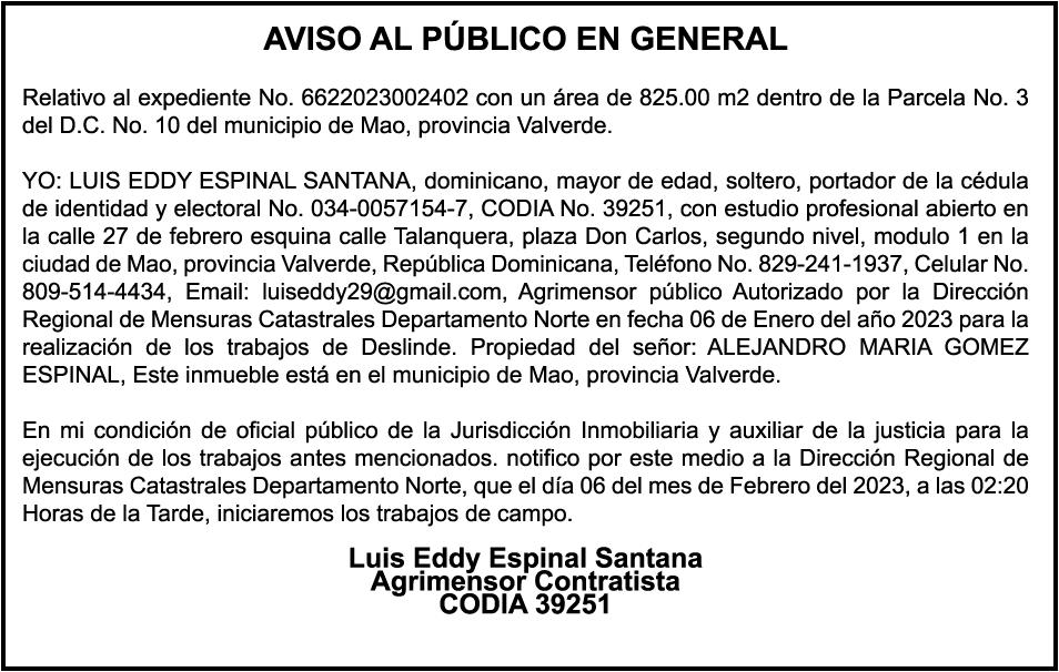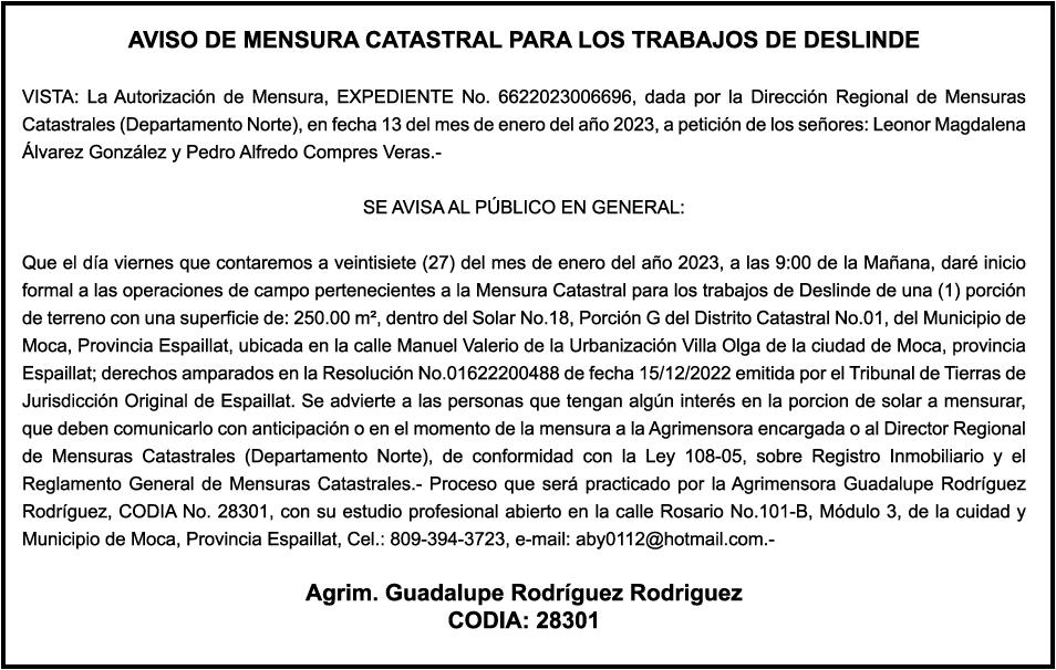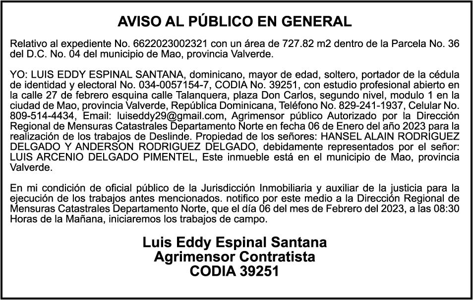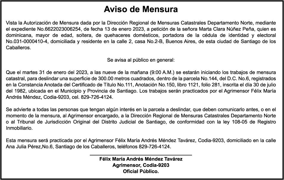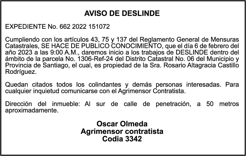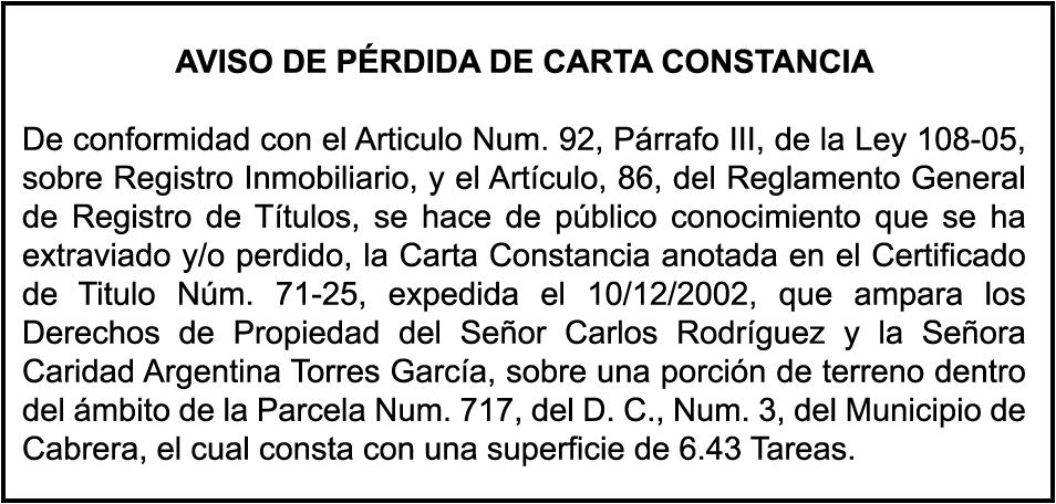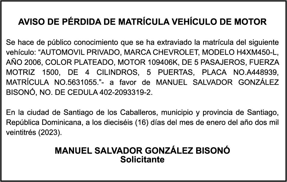 PERDIDA DE MATRICULA:De La Motocicleta, Placa N0X2100527, Cahsis LC2U62015M3100472, NKED 125, Marca KINKO AGILLITY, Color NEGRO, AÑO 2021, a nombre de JESUS ROSARIO REYES , Ced. 4021158881