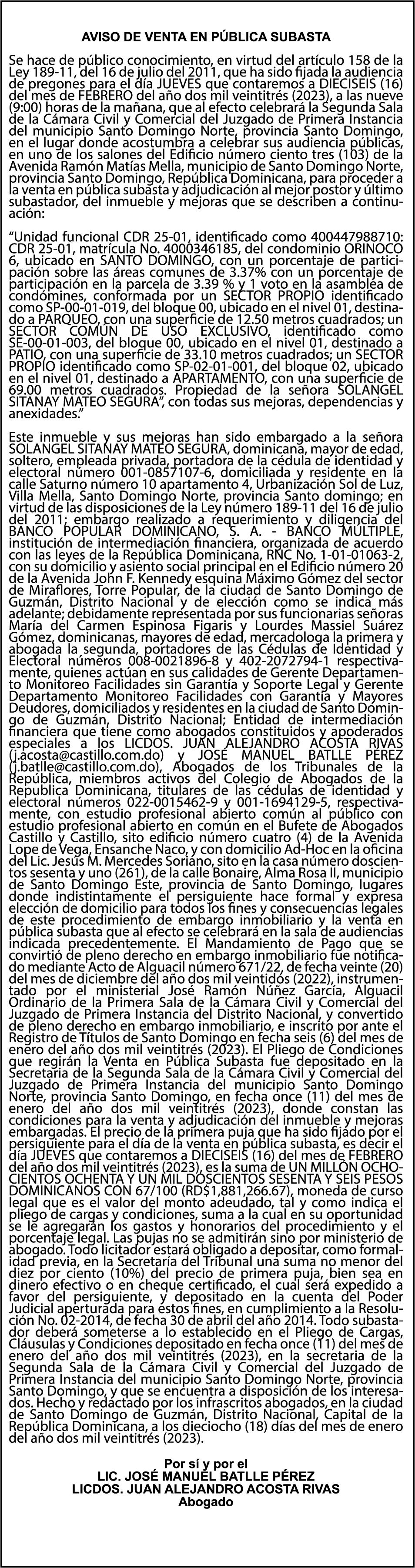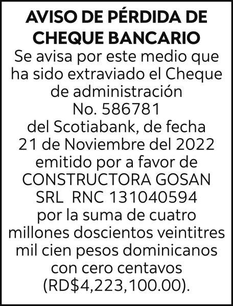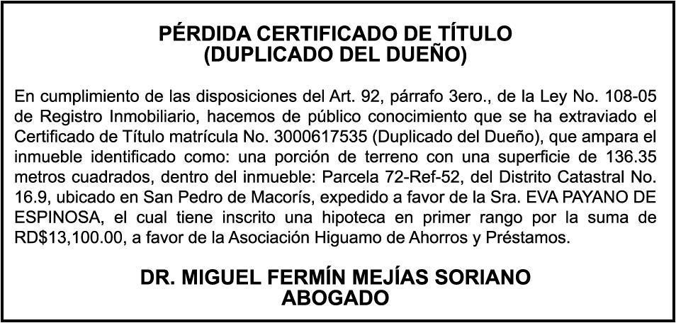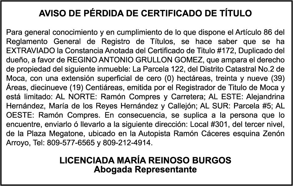 SE hace de público conocimiento la pérdida de certificado de depósito número 790133185 emitido Banco Popular Dominicano, S. A., a favor de RAMON VIRGILIO ALARCON PAYANO Portador de la Cédula de Identidad y Electoral número 023-0133161-3, certificado expedido en fecha 13 de marzo de 2015por el monto de (RD$10,018.00), de capital más intereses generados a la fecha.