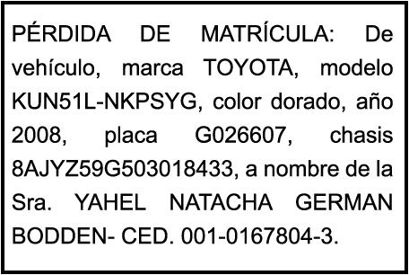 PERDIDA DE MATRICULA, del vehículo marca TOYOTA, Modelo BITZ, año 2003, color AZUL, Placa No. A524723, Chasis No. SCP102622612, a nombre de YAFREISY BATISTA, CED. No. 026-0147234-9