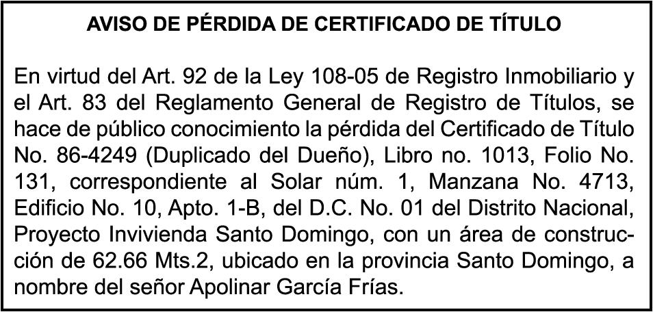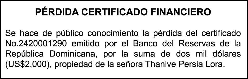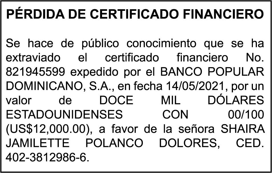 SE hace de público conocimiento la pérdida de certificado de depósito número 806919106 emitido Banco Popular Dominicano, S. A., a favor de JHAN CARLOS BINET DE LOS SANTOS Portador de la Cédula de Identidad y Electoral número 012-0113177-6, certificado expedido en fecha 19 de marzo de 2018 por el monto de (RD$95,784.79), de capital más intereses generados a la fecha.