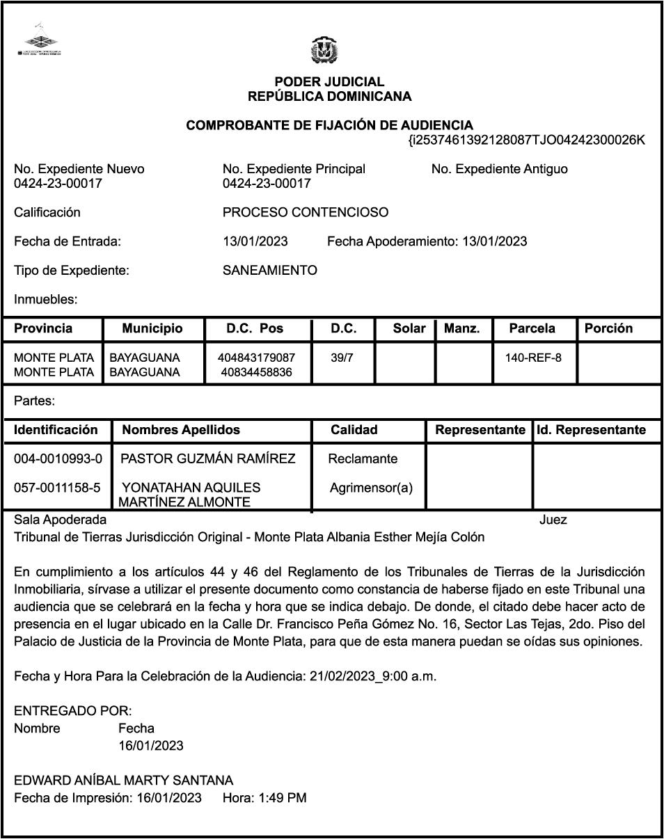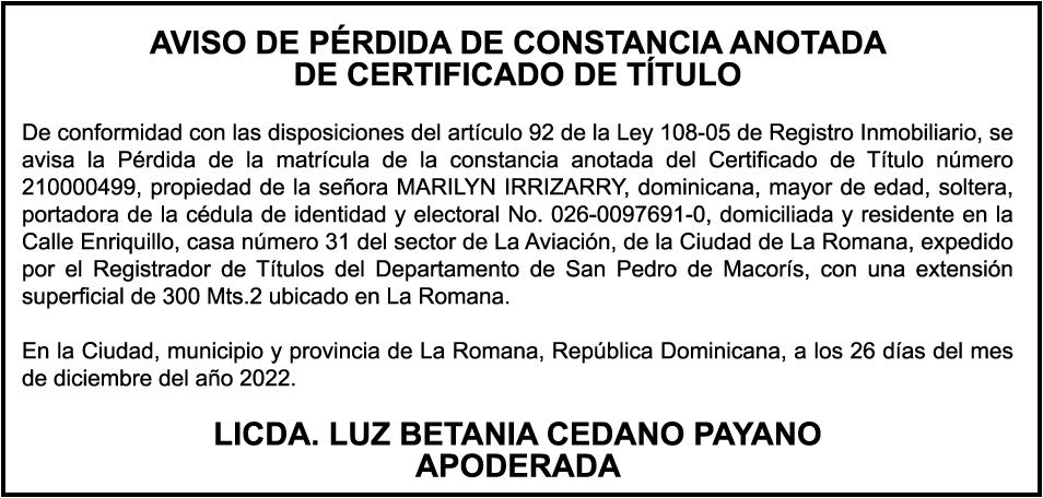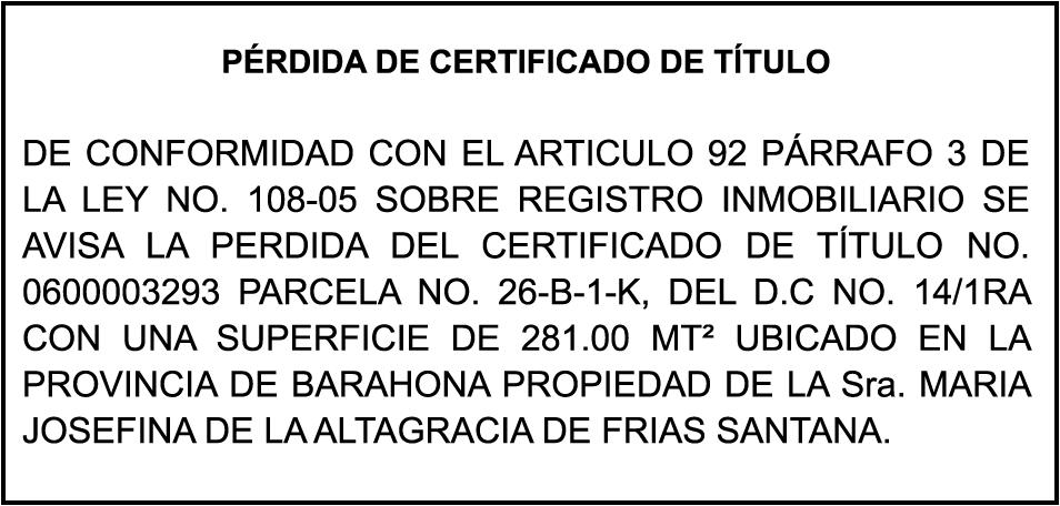 PERDIDA Certificado de Titulo, Identificado por la matricula 300073552, dentro del ámbito de la parcela No. 66, del D.C No. 10.3 de Higüey, con una superficie de 23,924.24 Mts2, a nombre de Jacoba Pereyda Penzo.