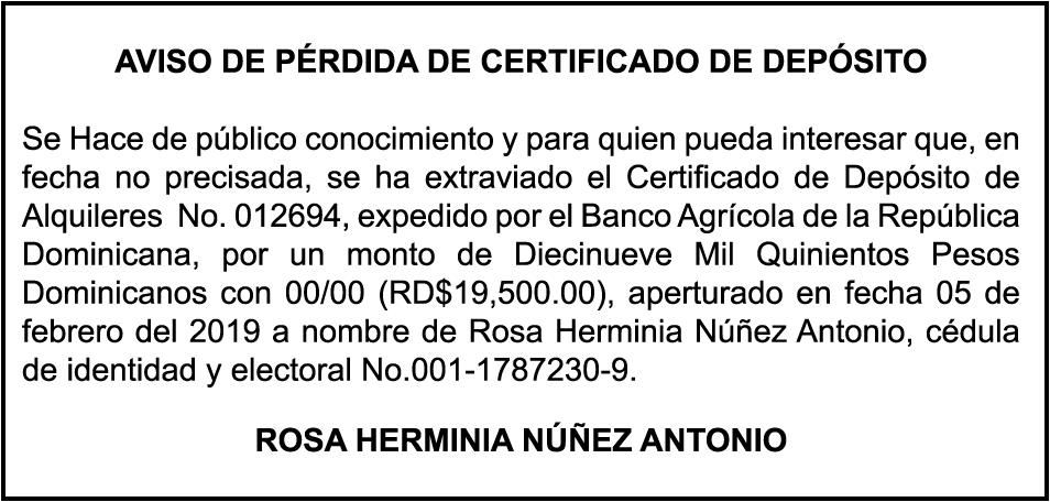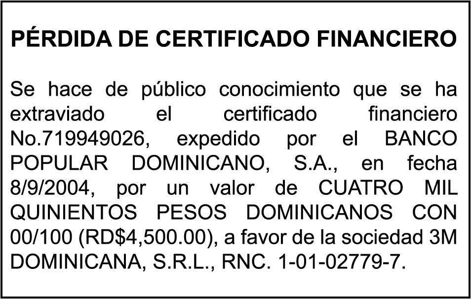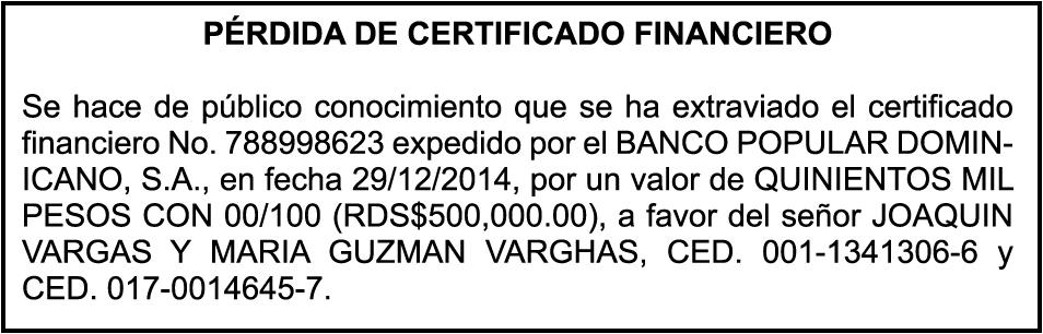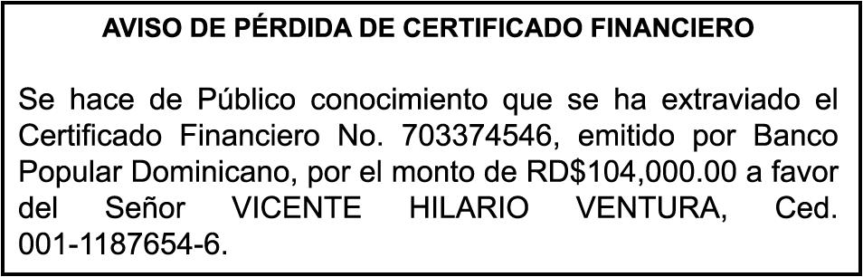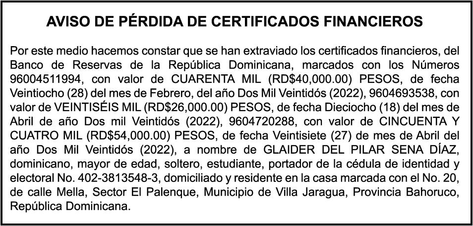 PERDIDA DE CERTIFICADO FINANCIERO No. 960-447233-8, emitido por el Banco De Reservas en fecha 15-02--2022, por el monto de RD$50,000.00 a nombre de ANGEL CONSTANTINO SANTANA.