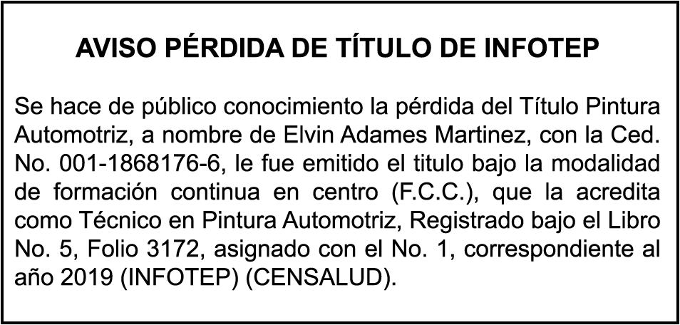 PERDIDA DE PLACANo. K0419182, Motocicleta LONCIN, Modelo CG125, Color negro, Año 2013, Chasis LLCLPP209DE112456, a nombre de MIGUEL ANGEL FELIZ.