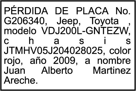 PERDIDA DE PLACA No. L226056, Veh. Carga TOYOTA, color gris, año 2001, chasis 5TEVL52N31Z762405, a nombre de DULCE MARIA GONZALEZ.