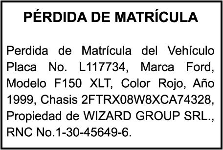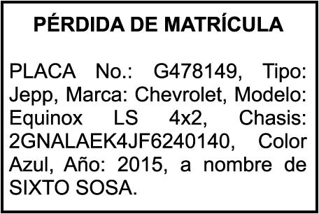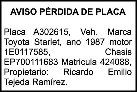 PERDIDA DE PLACA No. A026724, Automóvil Privado SUBARU, color blanco, año 2001, chasis jf1sf5lr51g084374, a nombre de JOSE ARTURO FRANCISCO CABRERA.