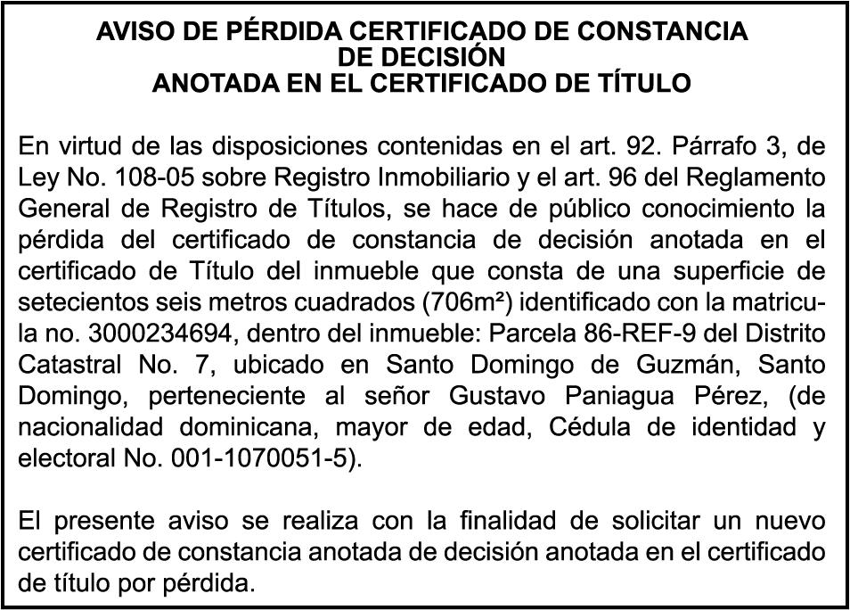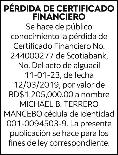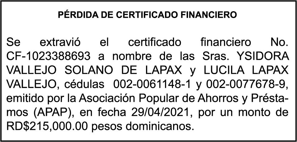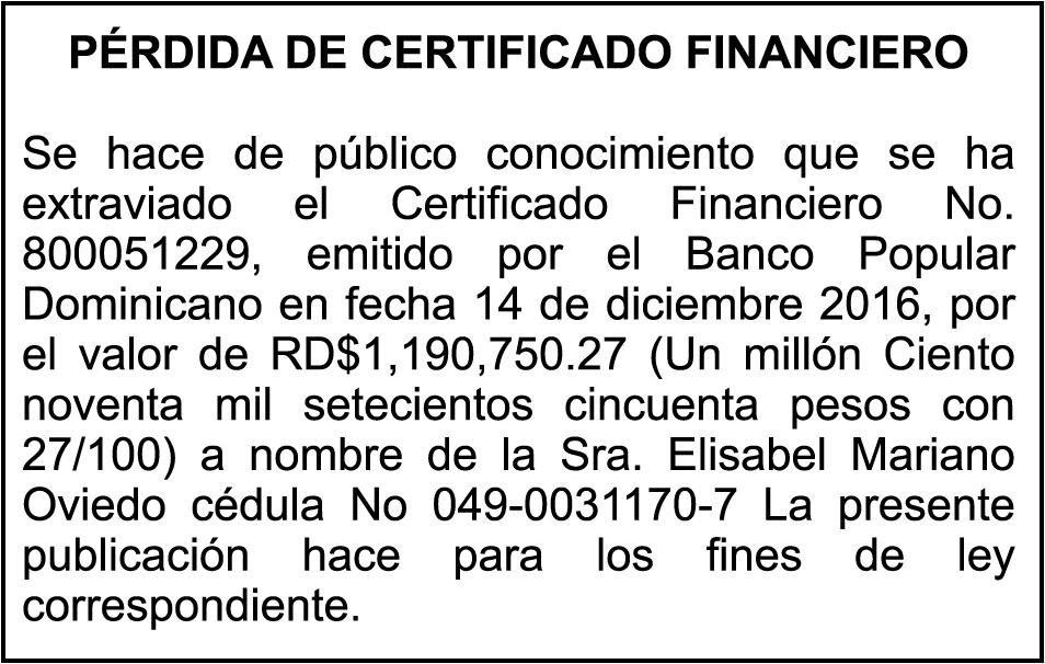 SE hace de público conocimiento la pérdida de certificado de depósito número 788903599 emitido Banco Popular Dominicano, S. A., a favor de YENY