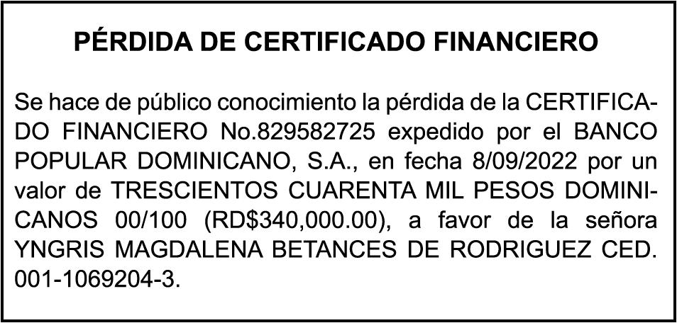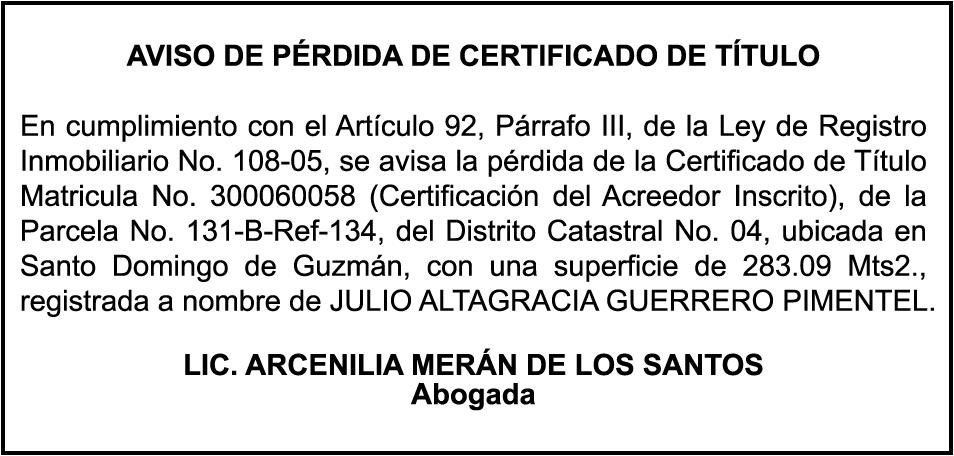 PERDIDA DE PLACA No. F000443, REMOLQUE, MARCA: TRAILER, año 2008, chasis 1018127889, a nombre de CEMENTOS SANTO DOMINGO S.A.