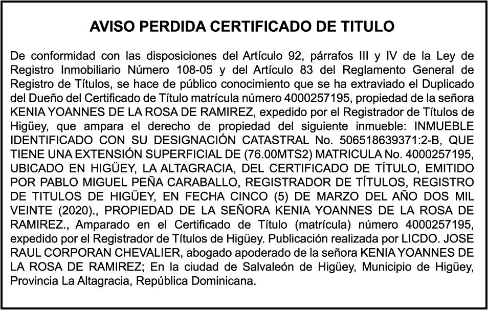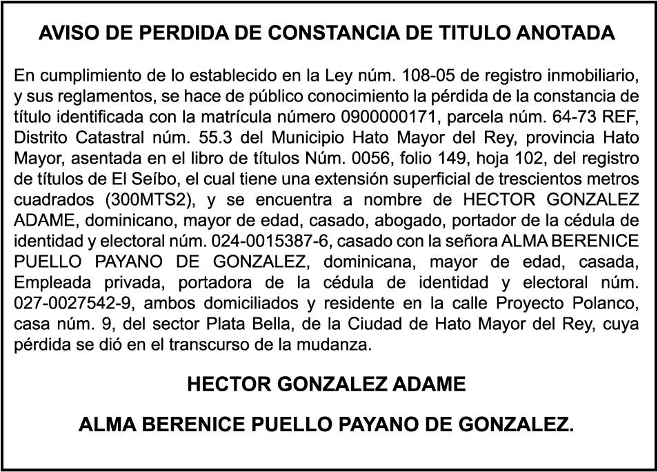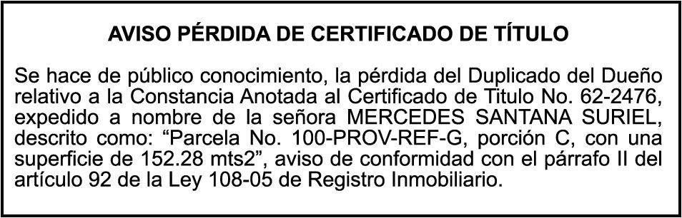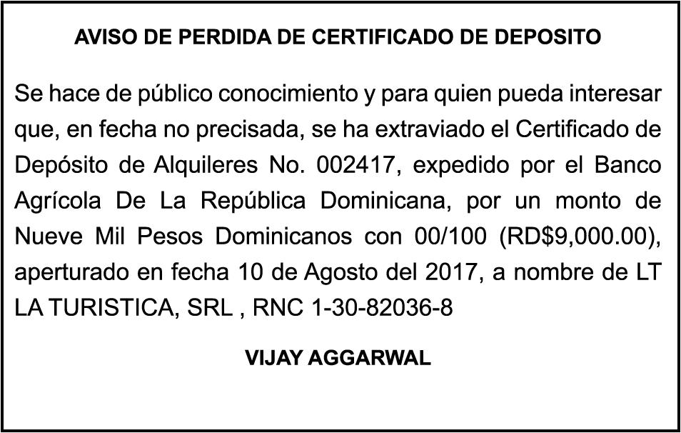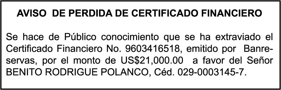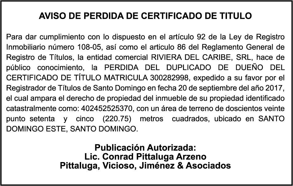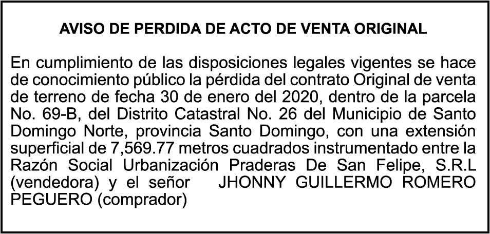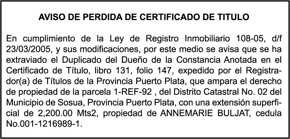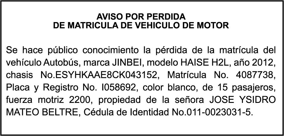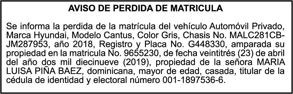 PERDIDA DE PLACANo. OP02435, Camioneta NISSAN FRONTIER, Año 2011, Chasis 3N6PD23Y5ZK882589, a nombre de POLICIA NACIONAL SE ha extraviado el recibo No. 22963104722-0, con un valor de RD$ 50,000.00, depositados en la DGII (Impuestos Internos) en calidad de consignación, de fecha 8-8-2022, a nombre de la señora Ana Dorka De Jesus Castillo.