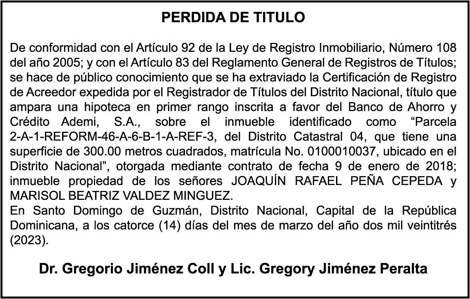 SE hace de público conocimiento la pérdida de certificado de depósito número 761416833 emitido Banco Popular Dominicano, S. A., a favor de MARTHA GEORGINA PARRA ALCANTARA Cédula de Identidad y Electoral número 001-1377219-8, expedido en fecha 28 de julio de 2010 por el monto de (RD$100,000.00).