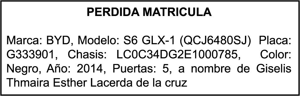 PERDIDA DE PLACA No. OP02022, Camioneta MAZDA, Año 2005, Chasis MM7UNY08250391796, a nombre de POLICIA NACIONAL PERDIDA DE PLACA No. K2111996, Motocicleta TVS, Modelo SPORT ES 100, Color NEGRO / VERDE, Año 2019, Chasis MD625MF57K1AL2859, a nombre de JACK DAVID PEÑA HERRERA.