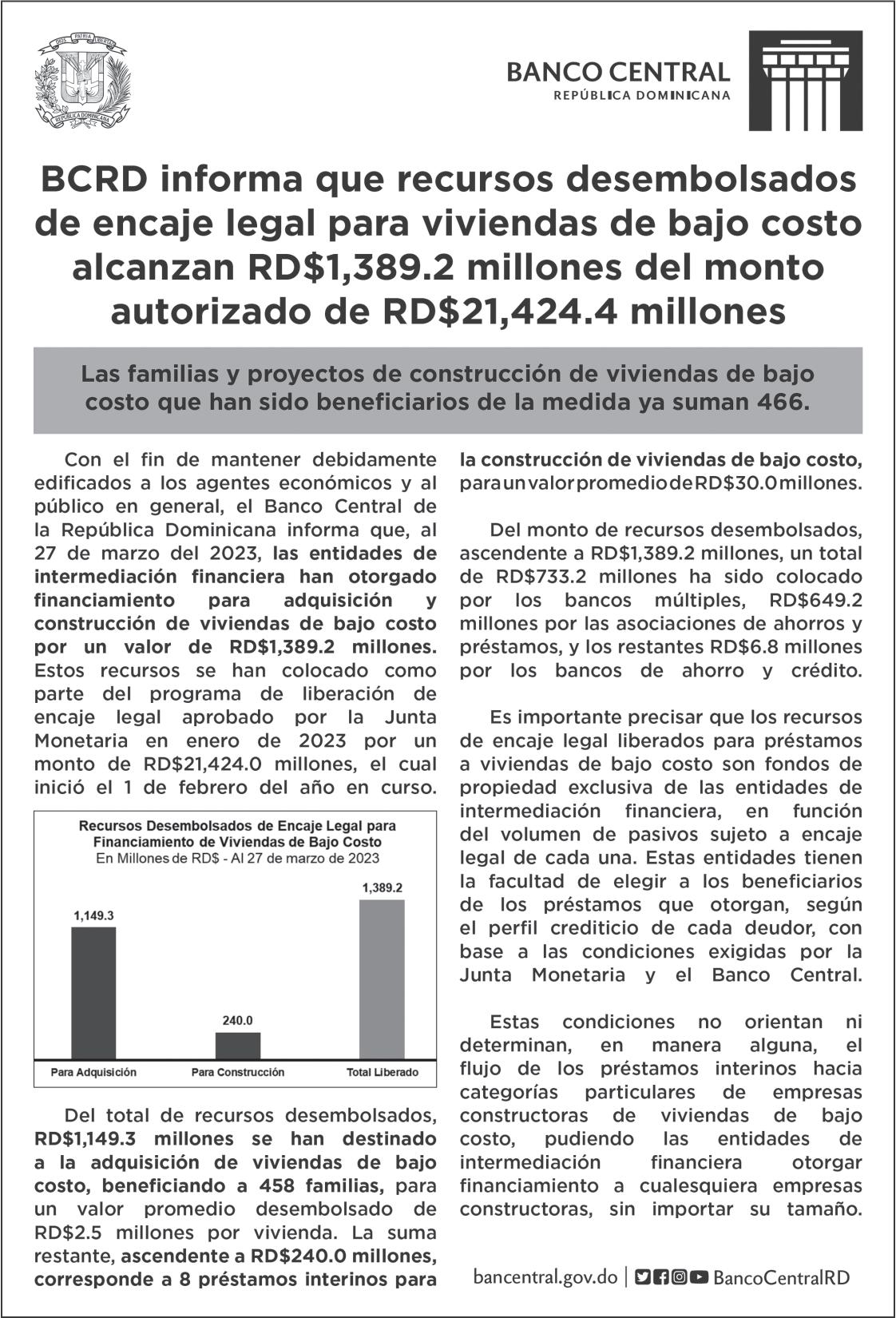 ENCAJE LEGAL. Banco Central informa entidades financieras han otorgado financiamiento para adquisición y construcción de viviendas en beneficio de 466 familias. P.23