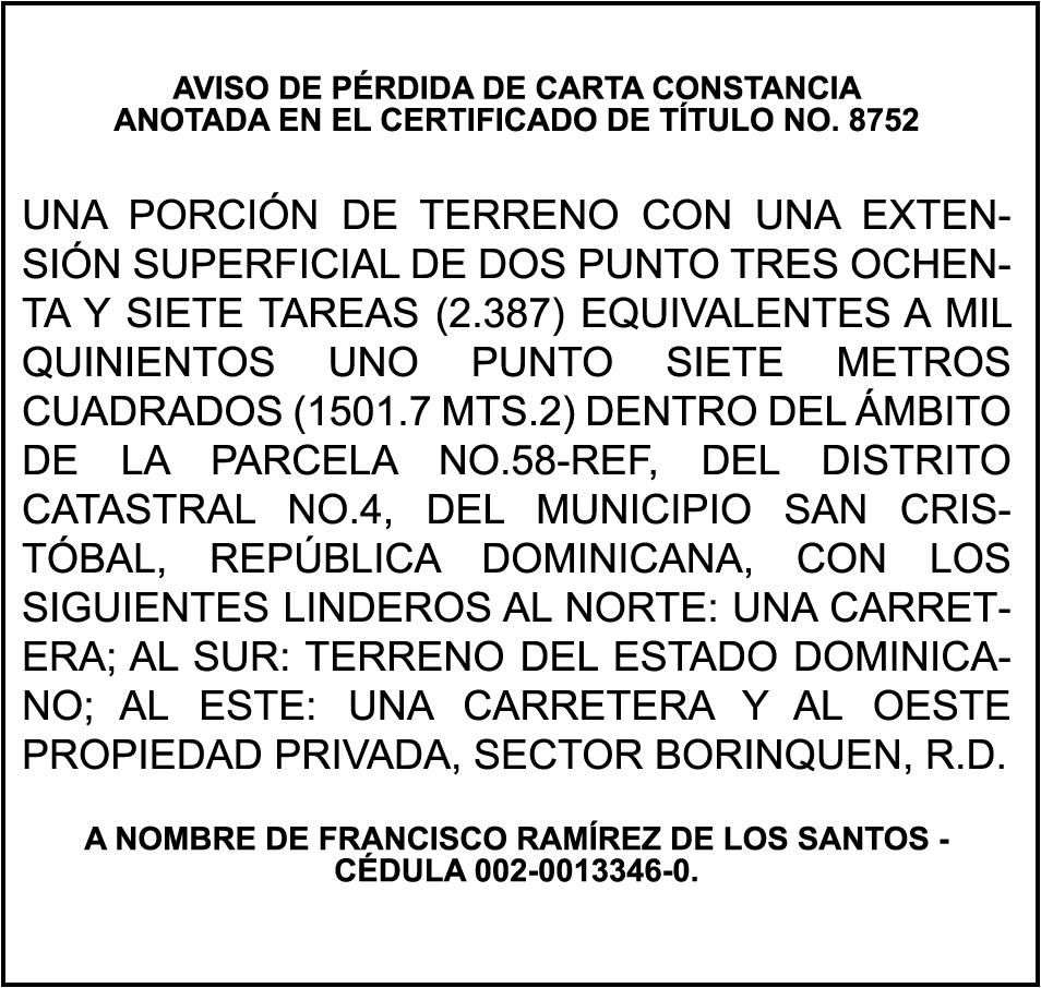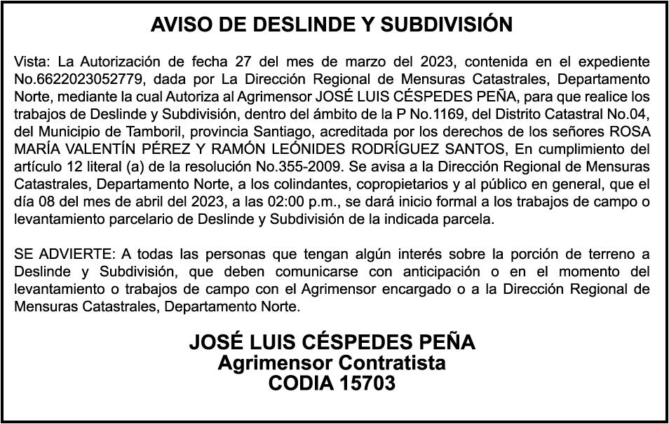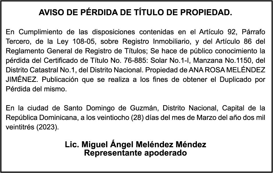 PERDIDA DE PLACA No. L352319, Veh. Carga NISSAN, modelo FRONTIER NP300 , color blanco, año 2016, chasis 3N6CD33B7ZK354925, a nombre de JIMMY WANDER CORDERO DE JESUS. SE hace de público conocimiento la pérdida de certificado de depósito número 832281125 emitido por Banco Popular Dominicano, S. A., a favor de ISABEL CARELA BRITO, Portadora de la Cedula de Identidad y Electoral número 402-2785597-6, expedido en fecha 15 de febrero de 2023 por el monto de (RD$50,000.00).