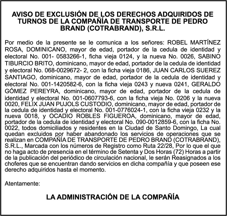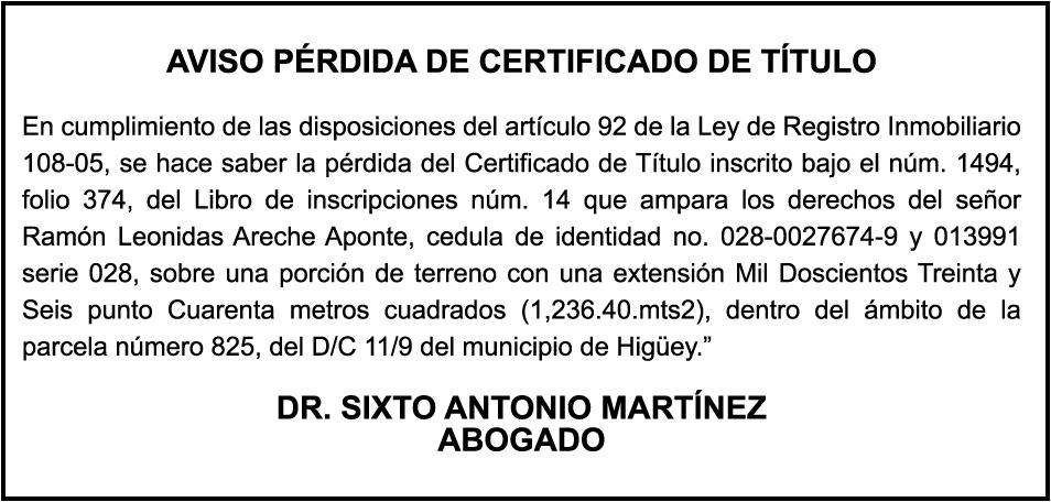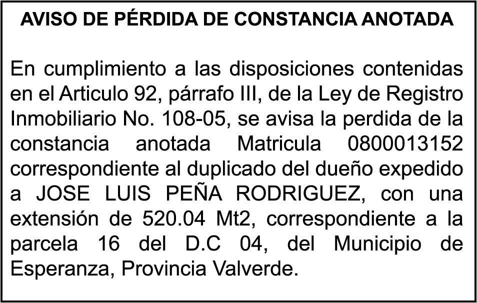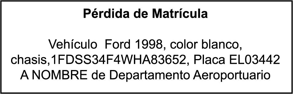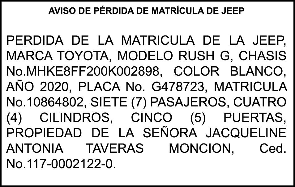 PERDIDA DE PLACA No. L100672, Veh. CARGA ISUZU, Modelo PICK UP, Color ROJO, Año 1989, Chasis JAACL16E8K7232473, a nombre de LONGINO CRUZ DE LA CRUZ. SE hace de público conocimiento la pérdida de la matricula G 362460, Jeep, marca Mercedes Benz, modelo GLC-300 año 2016, color Blanco, 5 pasajeros, chasis WSC0F4KB7GF007952, propiedad de Laura Cristina González Weise Cedula 001-1886936-1