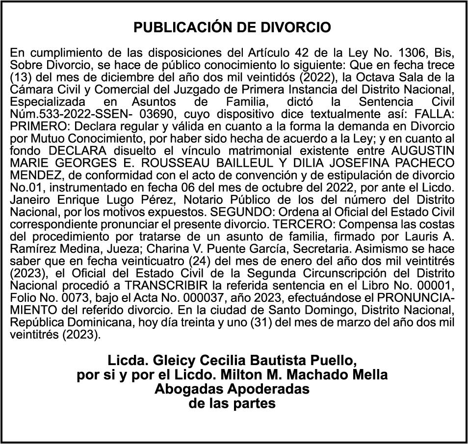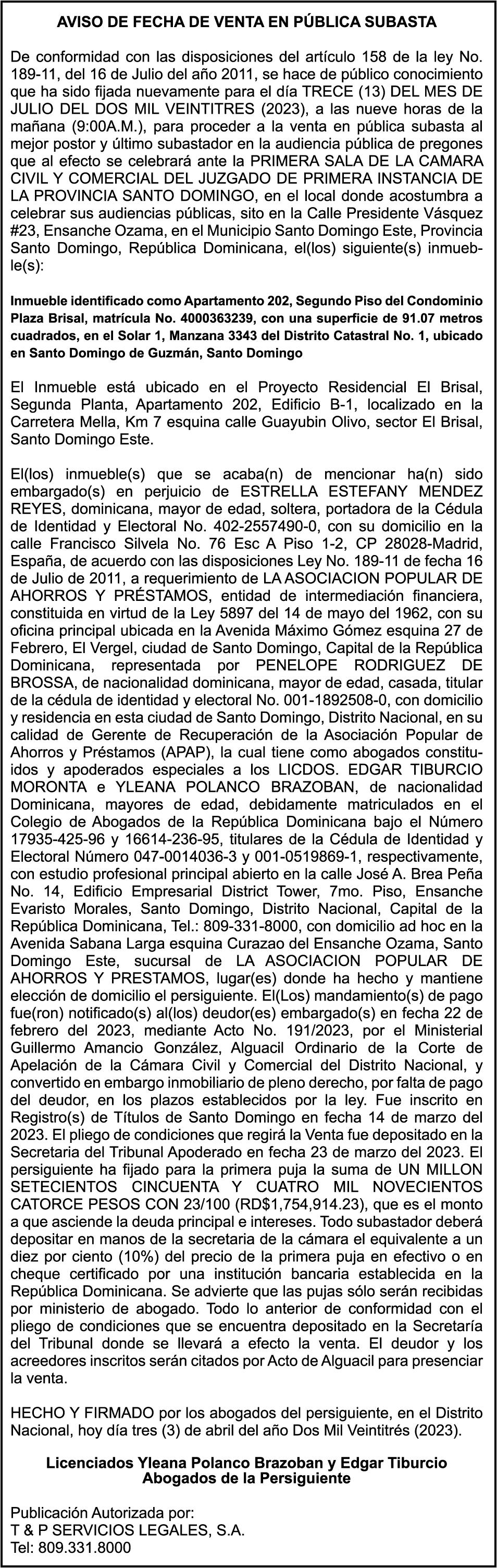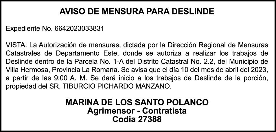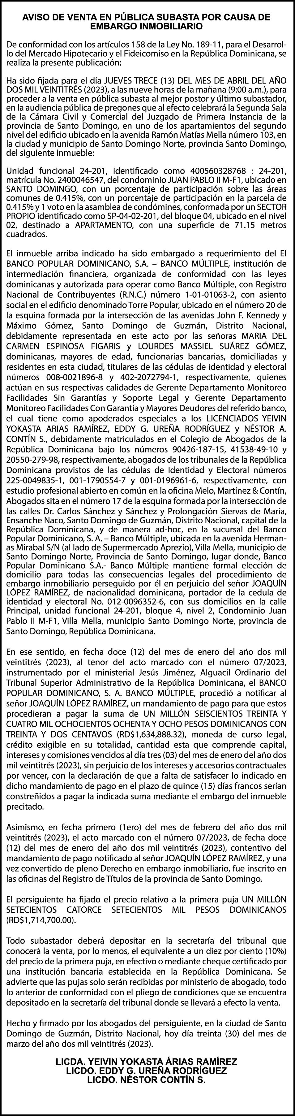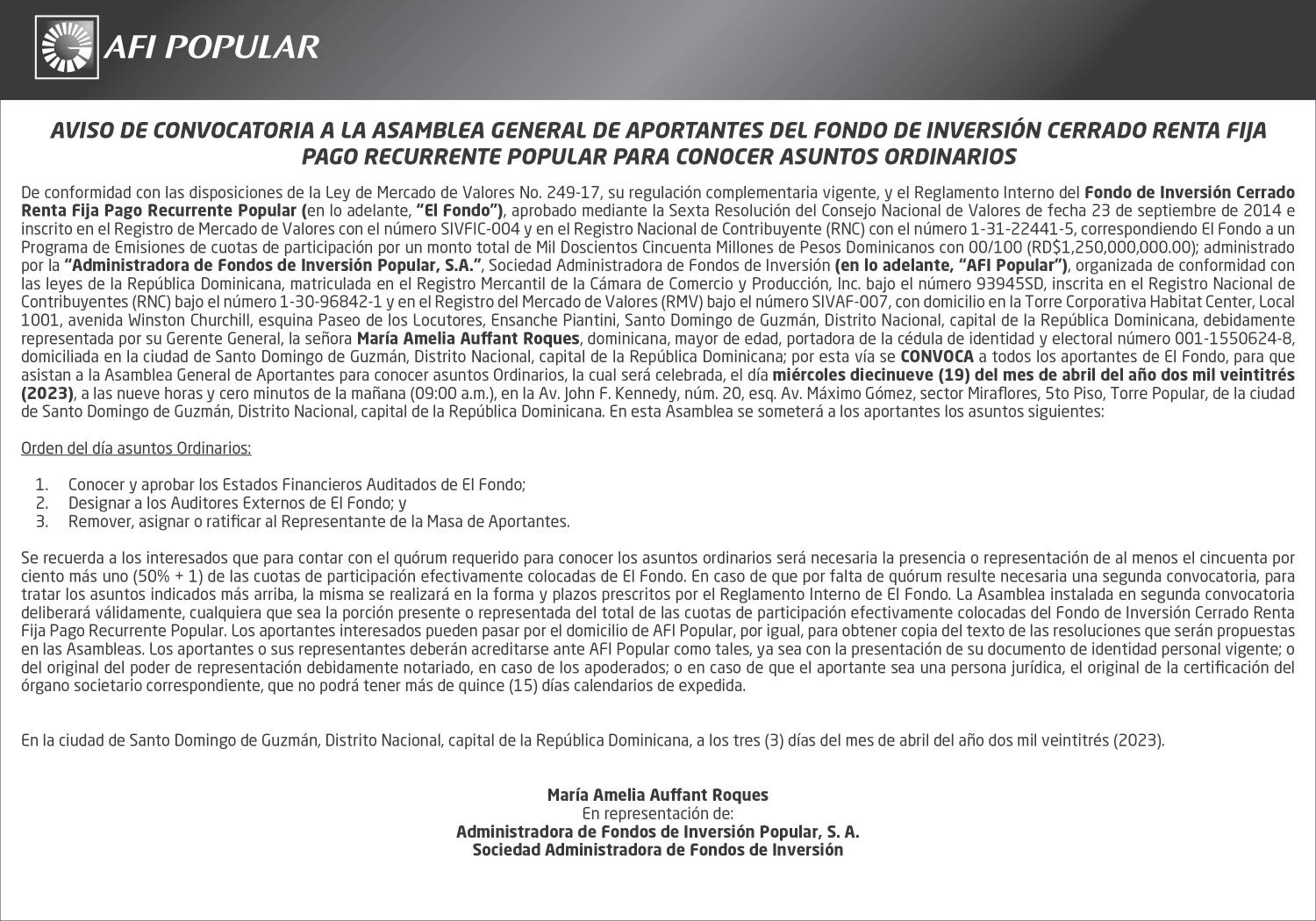 SE hace de público conocimiento la pérdida de certificado de depósito número 829376078 emitido por Banco Popular Dominicano, S. A., a favor de SANDRA ARISTY POLIMI, Portadora de la Cedula de Identidad y Electoral número 103-0010215-8, expedido en fecha 29 de agosto de 2022 por el monto de (RD$30,868.09).