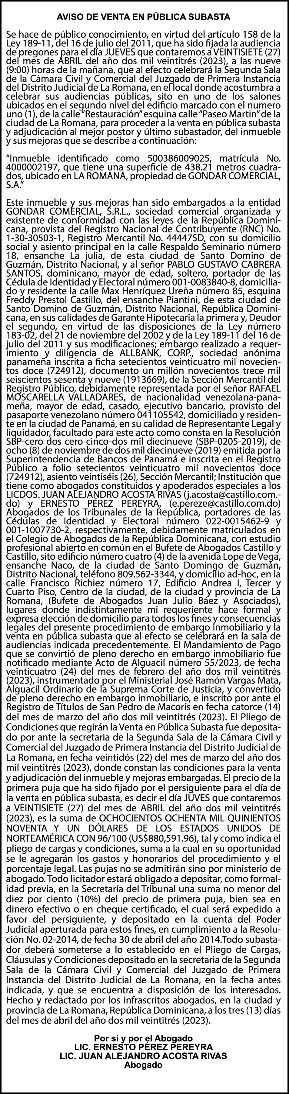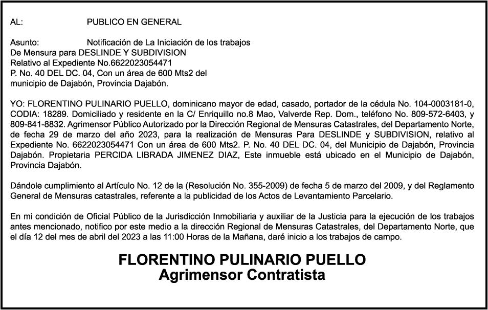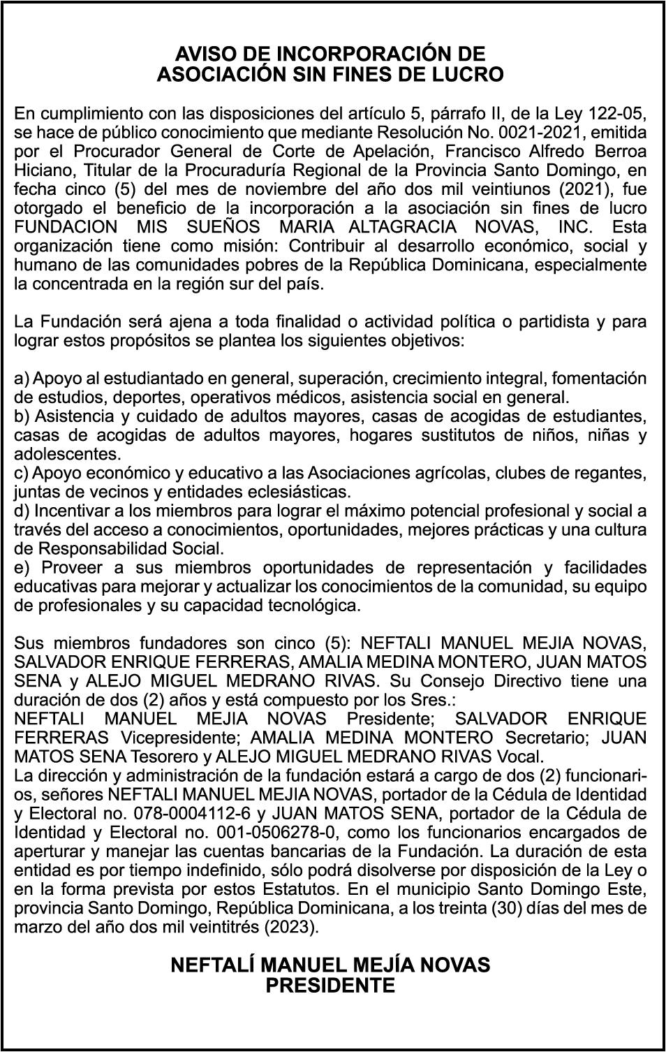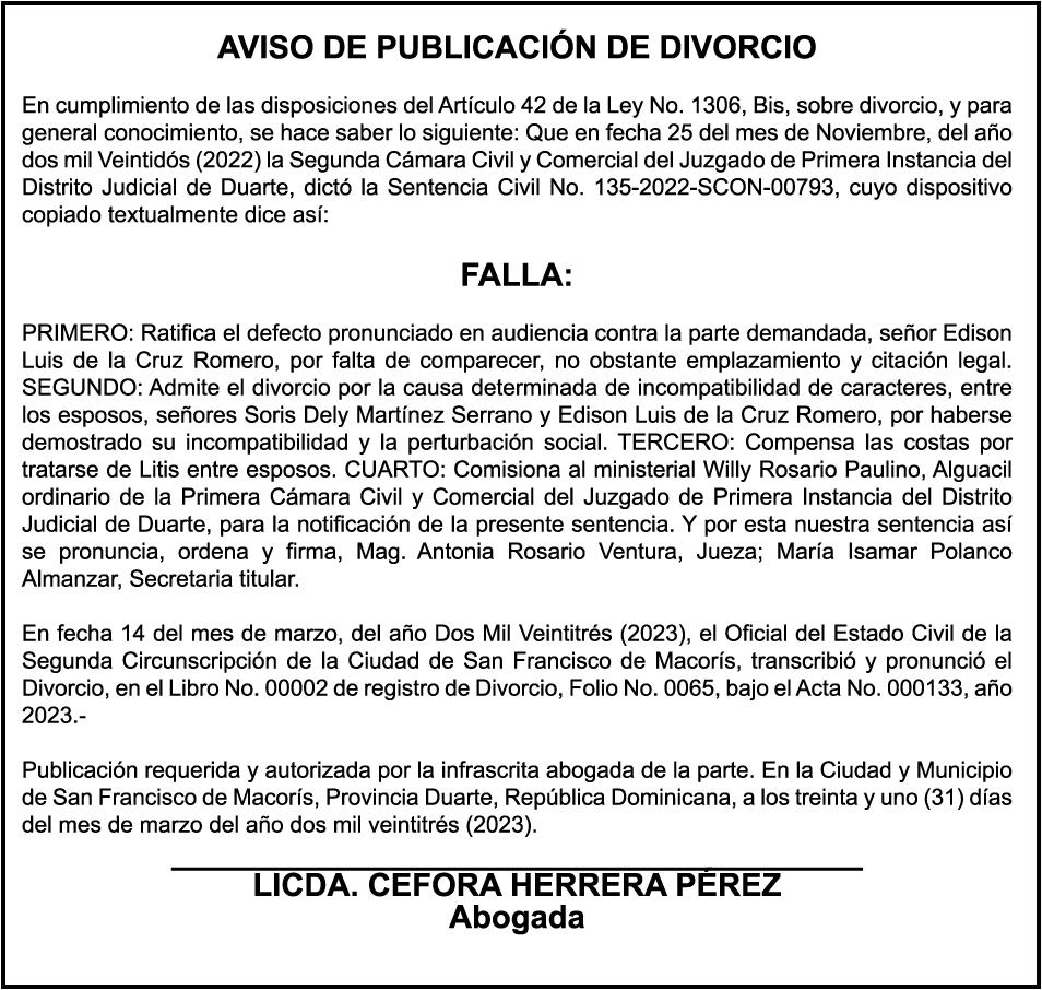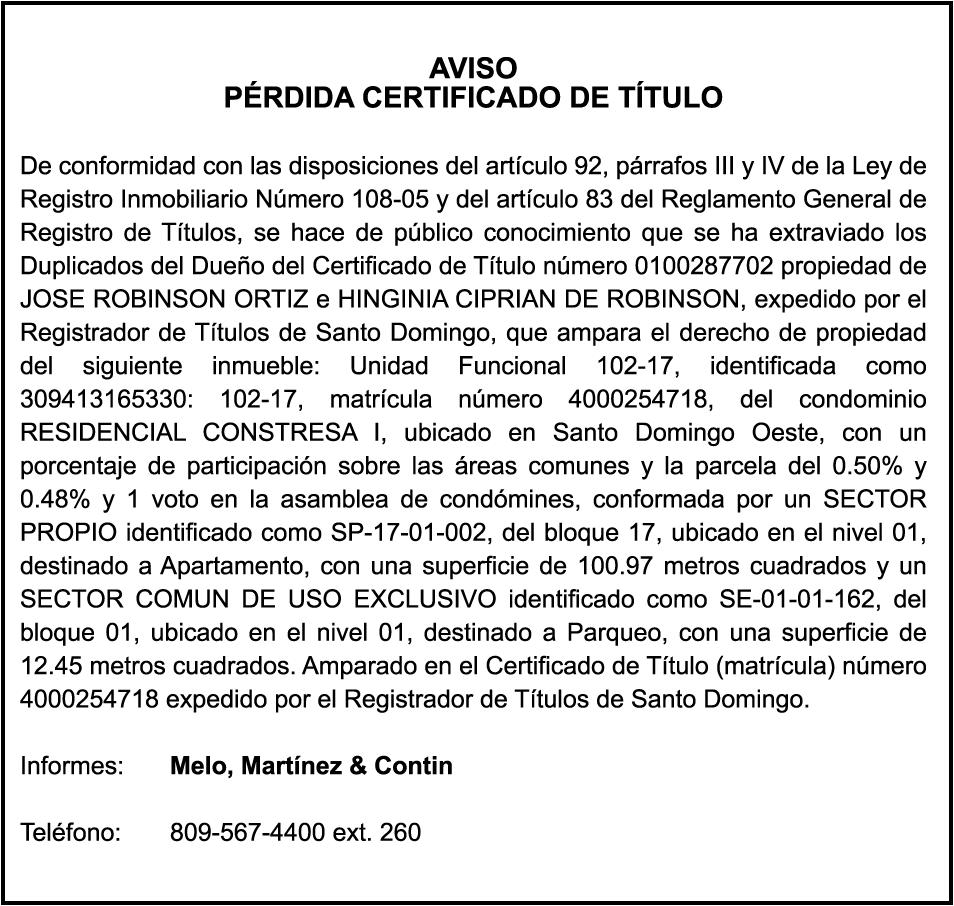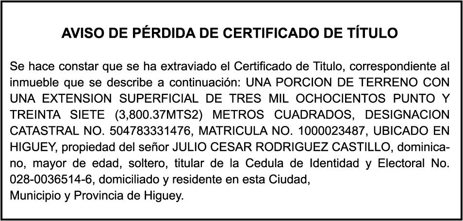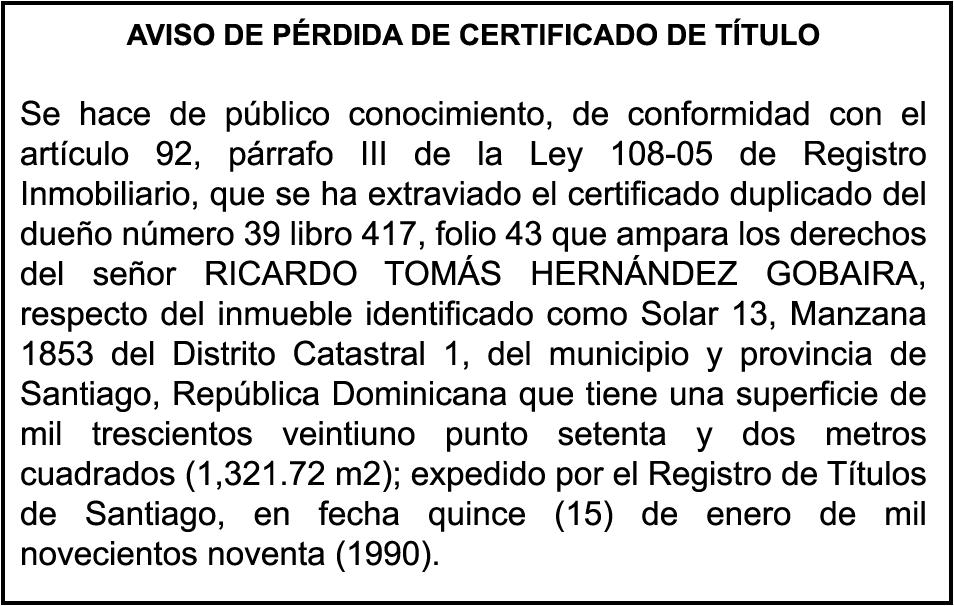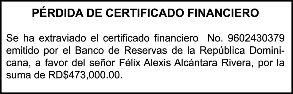 SE hace de público conocimiento la pérdida de certificado de depósito número 826598930 emitido por Banco Popular Dominicano, S. A., a favor de JOSE HUMBERTO HERNANDEZ CHAVEZ, Portador de la Cedula de Identidad y Electoral número 402-1918015-1, expedido en fecha 4 de marzo de 2022 por el monto de (RD$517,380.26).