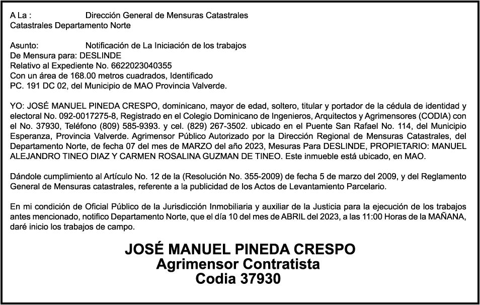 PERDIDA DE CONTRATO DE ARRENDAMIENTO DE SOLAR No. 07, Manzana No. 03, Ubicado en la calle, AV. LIBERTAD, No. 47, de la ciudad de La Romana, Rep. Dominicana a nombre del Sr. CARLOS MANUEL POUERIET.