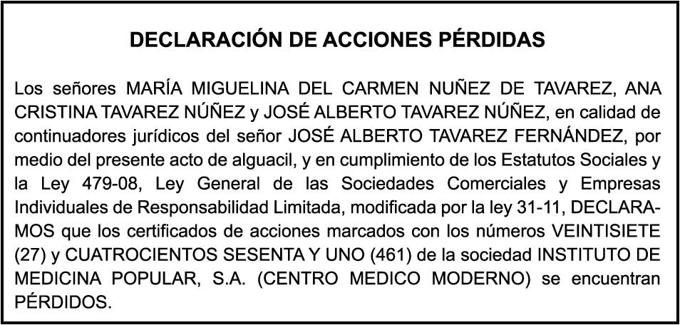 PERDIDA DE PLACA No. l317000, Veh. CARGA HYUNDAI, Color AZUL, Año 2011, Chasis KMFGA17CPBC148014, a nombre de YOMERLIN LEANDRO PEGUERO PEGUERO. PERDIDA DE PLACA NO. K1162982 DE LA MOTOCICLETA HONDA COLOR GRIS AÑO 1994 CHASIS