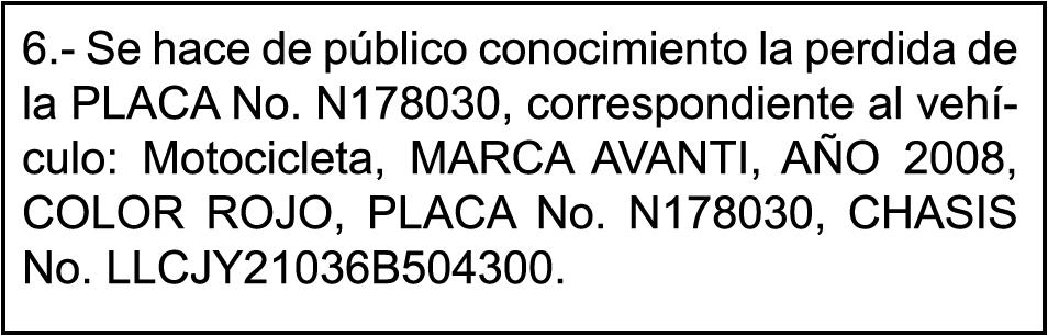 PERDIDA DE PLACA No. K1760897, Motocicleta SUCATI, Modelo CG 200, Color BLANCO, Año 2019, Chasis LBEPCX14TKB138614, a nombre de ADALGISA TEJEDA MARTINEZ.