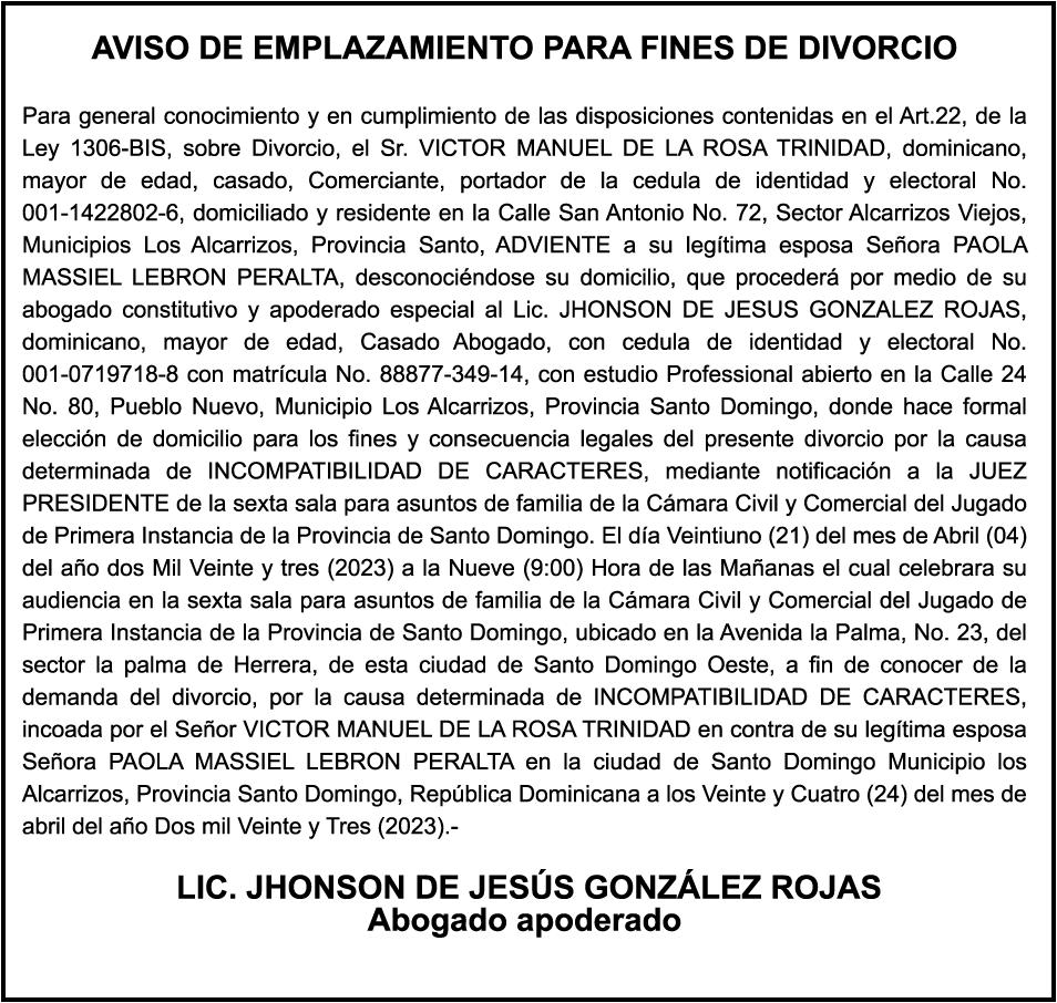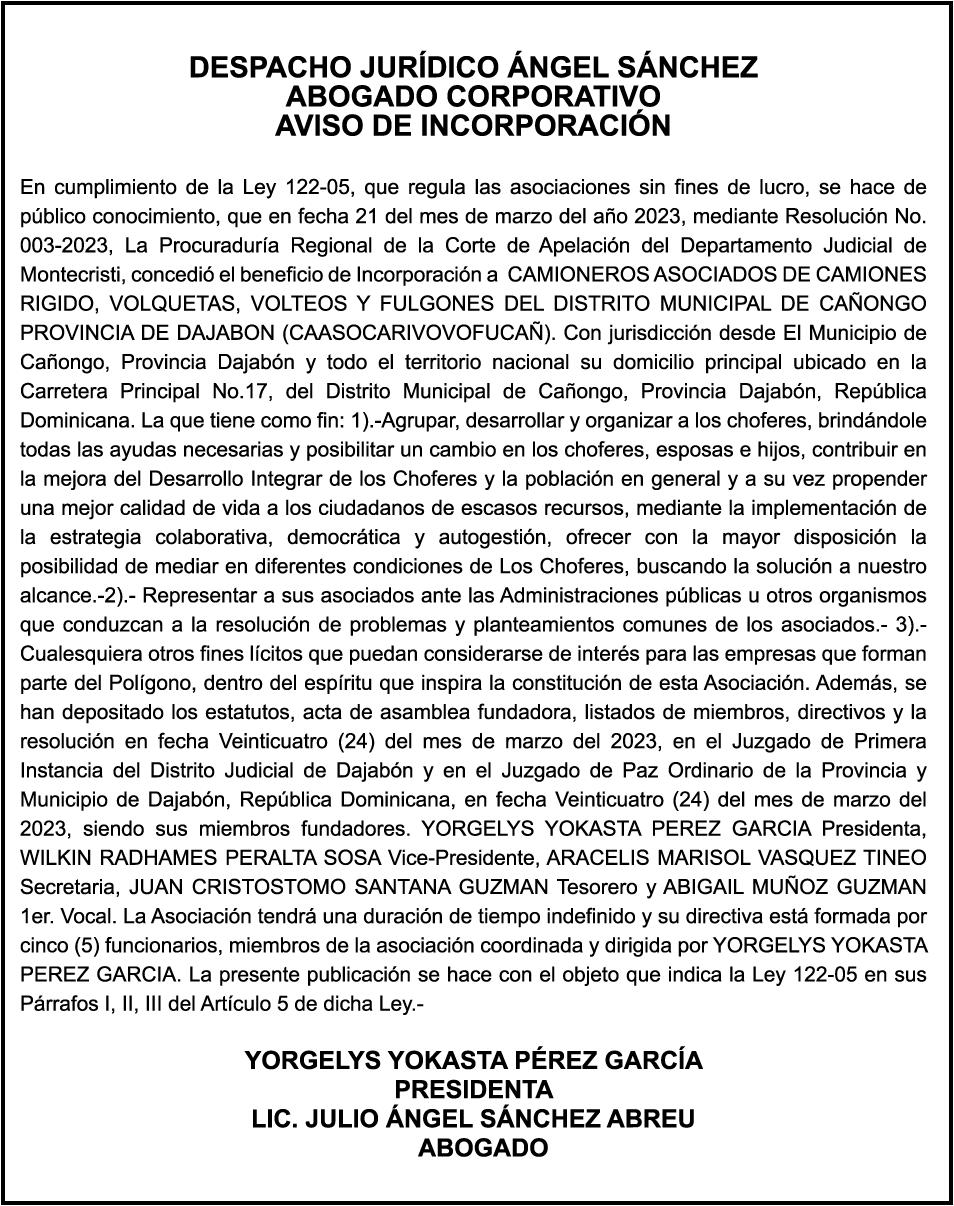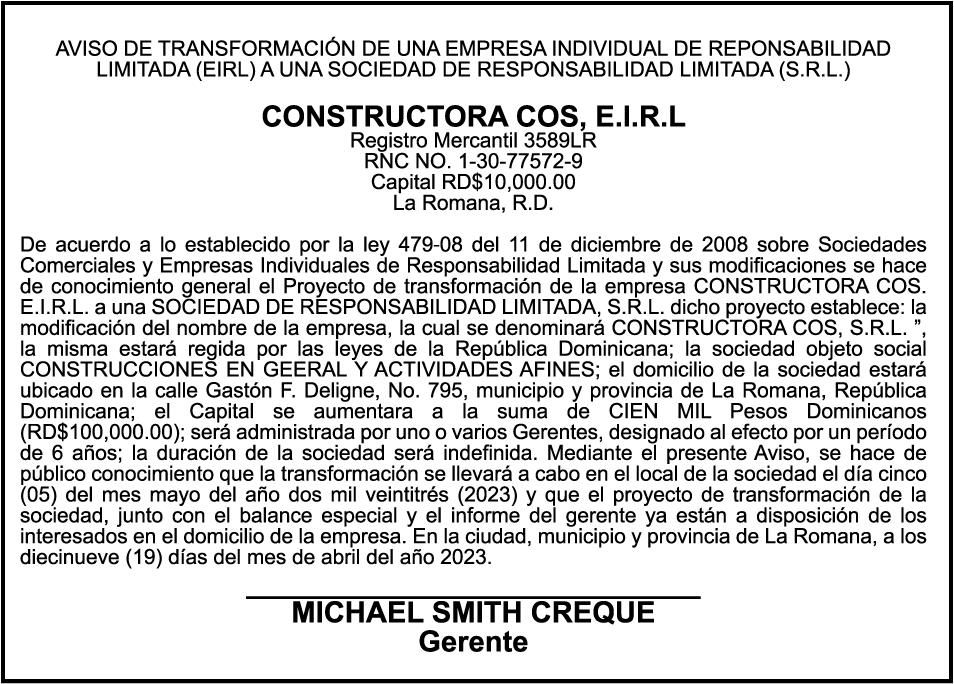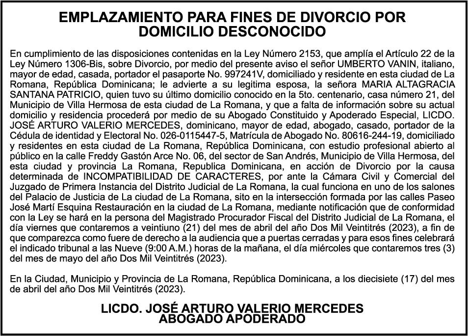 AVISO PERDIDA DE CERTIFICADO FINANCIERO Se hace constar la perdida del certificado financiero No. 9604268896, del Banco de Reservas, a nombre de MARCO ANTONIO CORNIEL, portador de cedula No. 001-1147193-4 el mismo fue aperturado el dia 25-11-2021 y vence el dia 25-11-2023.