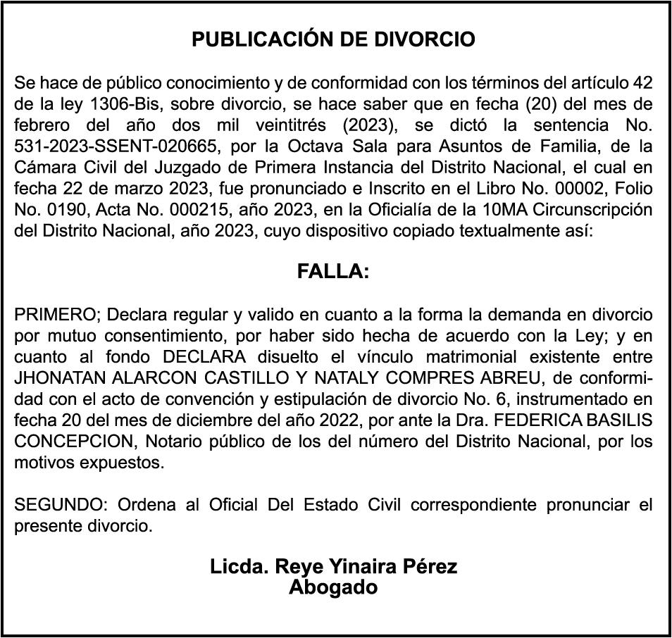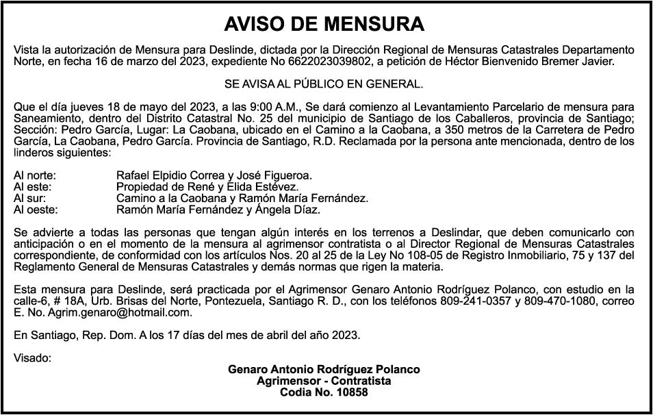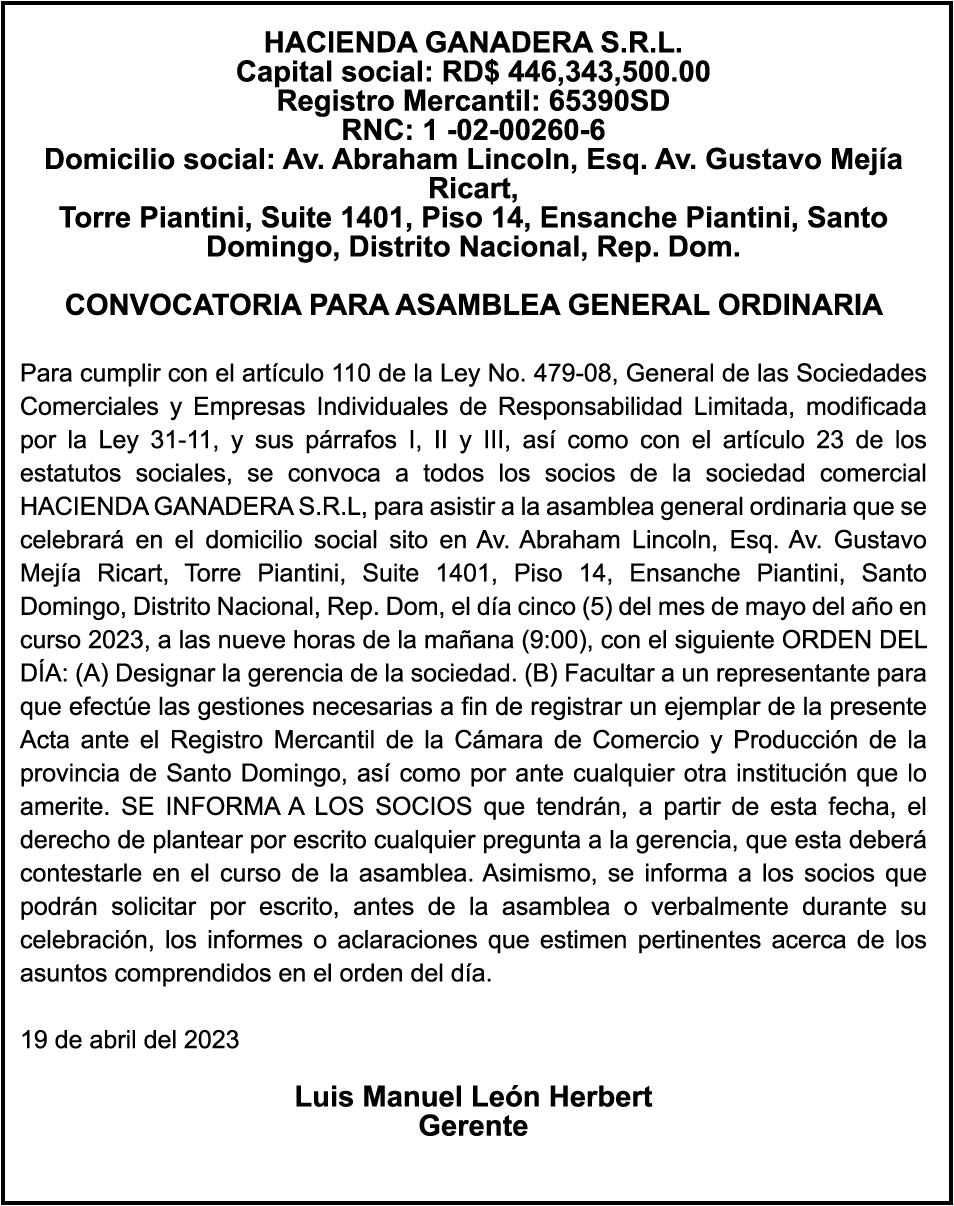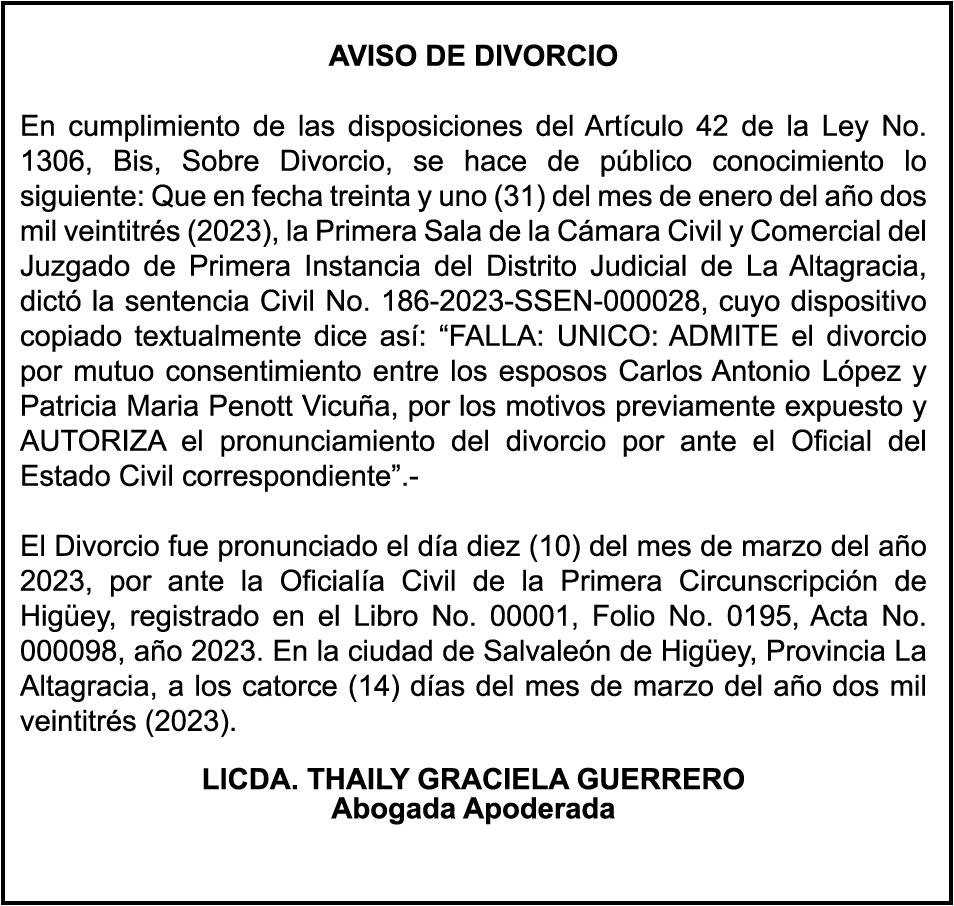 AVISO PERDIDA DE CERTIFICADO FINANCIERO Se hace constar la perdida del certificado financiero No. 9604268896, del Banco de Reservas, a nombre de MARCO ANTONIO CORNIEL, portador de cedula No. 001-1147193-4 el mismo fue aperturado el dia 25-11-2021 y vence el dia 25-11-2023.