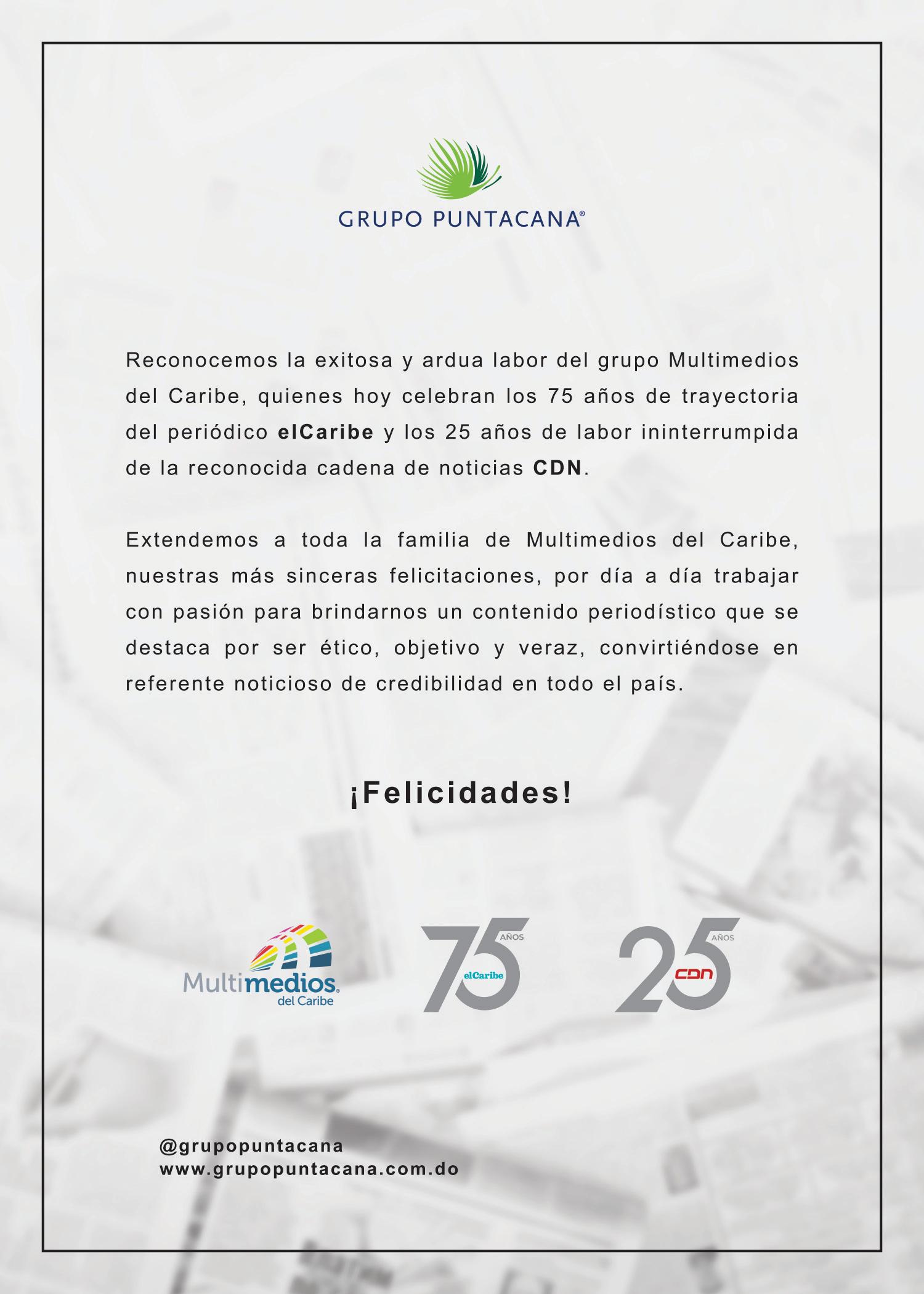 8:30 A.M. Celebración de los 75 años de elcaribe y el 25 aniversario de CDN. Salón Gran Embajador, Hotel Embajador.