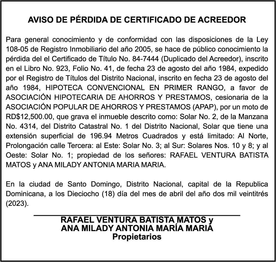 SE hace de público conocimiento la pérdida de certificado de depósito número 833008253 emitido Banco Popular Dominicano, S. A., a favor de MANUEL MARTINEZ RIJO Cédula de Identidad y Electoral número 025-0027645-2, expedido en fecha 28 de marzo de 2023 por el monto de (RD$2,000,000.00),