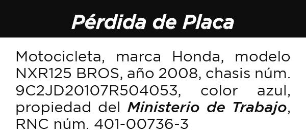 PERDIDA DE PLACA No. N9059198, Motocicleta KYM, Modelo 100T-2A, Color NEGRO, Año 2013, Chasis LUPTCG2A5D2000082, a nombre de BARTOLO TRINIDAD DE LOS SANTOS. PERDIDA DE MATRICULA Motocicleta X-1000, modelo CG-200, color rojo vino, año 2016, placa K0677833, chasis TBL20P109GHA43983, a nombre de ARMANDO DE LOS SANTOS MERAN.