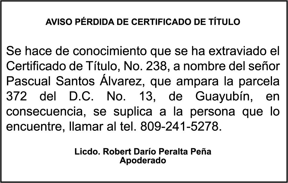 SE hace de público conocimiento la pérdida de certificado de depósito número 830349163 emitido Banco Popular Dominicano, S. A., a favor de MARIA ALTAGRACIA PACHECO REINOSO Cédula de Identidad y Electoral número 023-0005338-2, expedido en fecha 25 de octubre de 2022 por el monto de (RD$900,000.00).