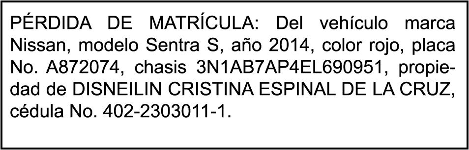 PERDIDA DE MATRICULA, del vehículo marca NISSAN, Modelo TIIDA, año 2012, color GRIS, Placa No. A677316, Chasis No. C11435876, a nombre de MIRIAM ESTHER GALVEZ ACEVEDO, CED, No. 026-0069936-3