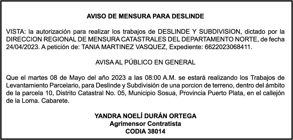 AVISO DE TRASPASO DE EMBARCACION la Sra. TEODORA FELIZ ORTIZ, Ced. No. 0027852-3 Serie 018, le traspasa a el Sr. JOSE ANTONIO TIBURCIO, Ced. No. 100-0001379-6, una embarcación de nombre GALBETIC, color BLANCO Y AZUL, de, manga 5' 0" y puntal 2' 0", de matrícula no. BR-G23-0580H, Placa No. 039494, Construida en MADERA Y FIBRA DE VIDRIO.