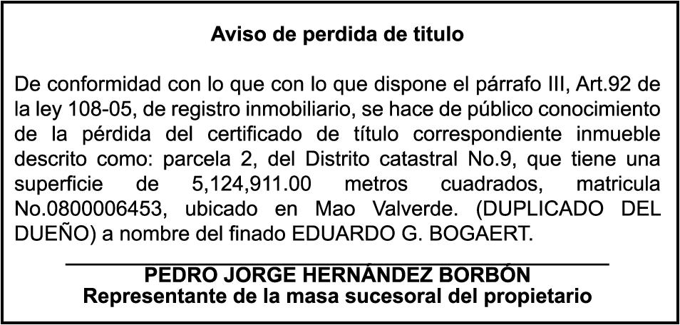 PERDIDA DE MATRICULA AUtomóvil Privado DAIHATSU, modelo L701L5-GHDF, color verde, año 2001, placa A301965, chasis JDAL7013001040596, a nombre de MARIA DEL ROSARIO GARCIA. SE hace de público conocimiento la pérdida de certificado de depósito número 827458332 emitido Banco Popular Dominicano, S. A., a favor de ARIHANNI DARISSA ELENA CASTRO Cédula de Identidad y Electoral número 402-23162617, expedido en fecha 27 de abril de 2022 por el monto de (RD$51,082.79),