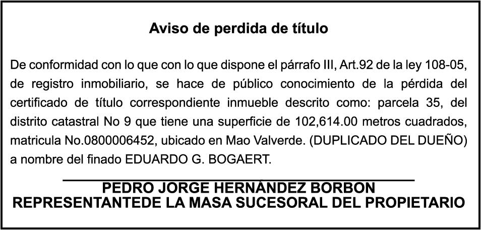 Automovil Privado SUZUKI, Modelo ALTO, Color BLANCO, Año 2012, Placa A837630, Chasis HA25V724144, a nombre de ROBERTO DE JESUS FERNANDEZ CASANOVAS. SE hace de público conocimiento la pérdida de certificado de depósito número 720471192 emitido Banco Popular Dominicano, S. A., a favor de ISMAEL VALENTIN VALENTIN MENDEZ Cédula de Identidad y Electoral número 001-0916117-4, expedido en fecha 6 de octubre de 2004 por el monto de (RD$500,000.00).